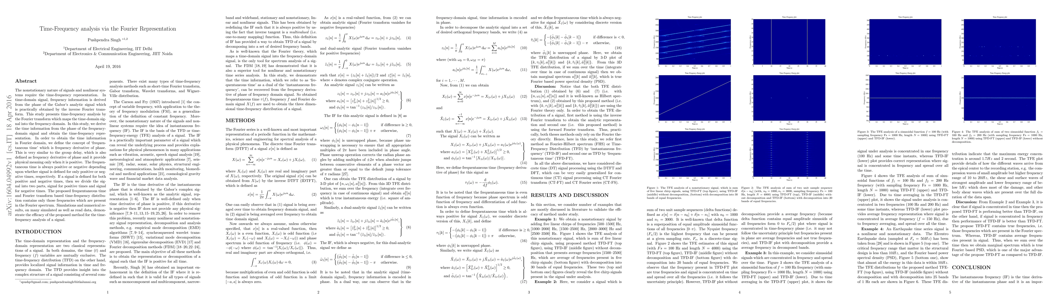 This paper proposes a time-frequency analysis method using the Fourier transform, where time information is derived from the phase of the frequency-domain signal through the concept of `frequentaneous time'. The method is validated through simulations demonstrating its effectiveness for analyzing nonstationary signals.