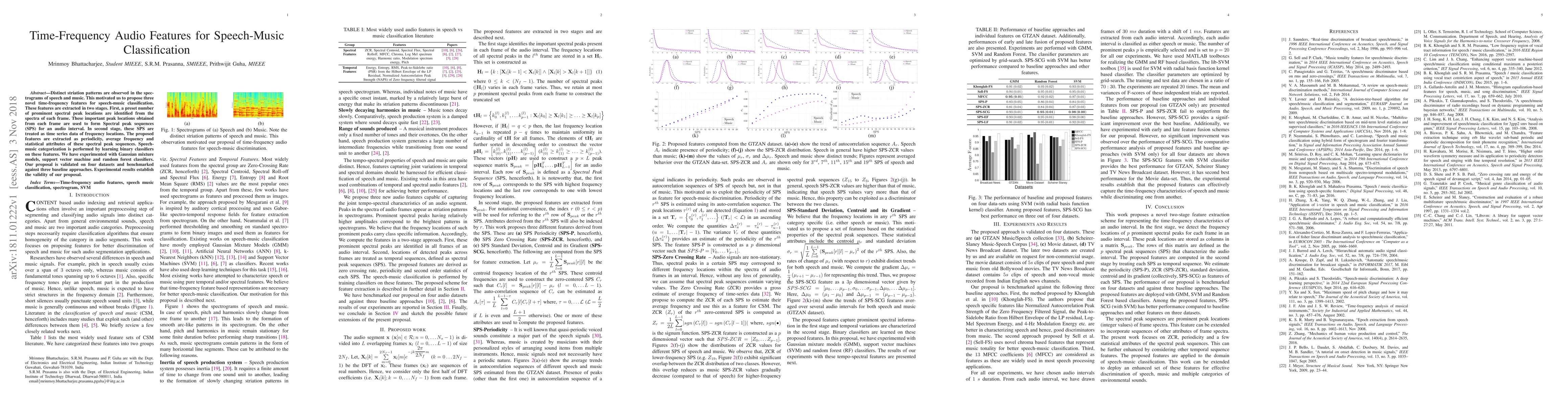 This paper proposes three novel time-frequency features for speech-music classification based on spectral peak sequences derived from spectrograms. The features include periodicity, average frequency, and statistical attributes, which are evaluated using Gaussian mixture models, support vector machines, and random forest classifiers, demonstrating superior performance against baseline methods.