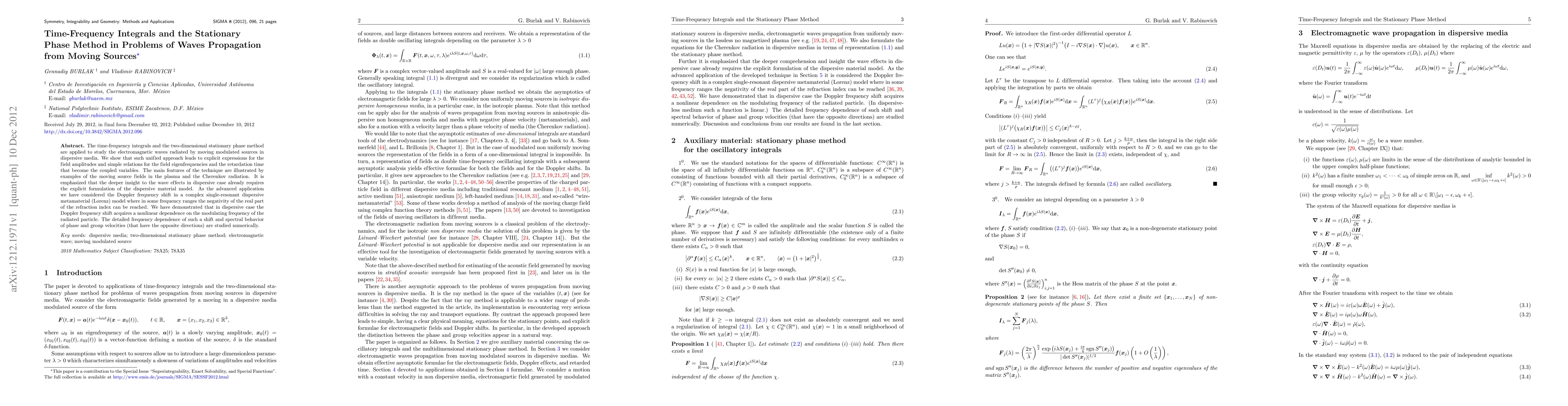 The time-frequency integrals and the two-dimensional stationary phase method are applied to study the electromagnetic waves radiated by moving modulated sources in dispersive media. We show that such unified approach leads to explicit expressions for the field amplitudes and simple relations for the field eigenfrequencies and the retardation time that become the coupled variables. The main features of the technique are illustrated by examples of the moving source fields in the plasma and the Cherenkov radiation. It is emphasized that the deeper insight to the wave effects in dispersive case already requires the explicit formulation of the dispersive material model. As the advanced application we have considered the Doppler frequency shift in a complex single-resonant dispersive metamaterial (Lorenz) model where in some frequency ranges the negativity of the real part of the refraction index can be reached. We have demonstrated that in dispersive case the Doppler frequency shift acquires a nonlinear dependence on the modulating frequency of the radiated particle. The detailed frequency dependence of such a shift and spectral behavior of phase and group velocities (that have the opposite directions) are studied numerically.