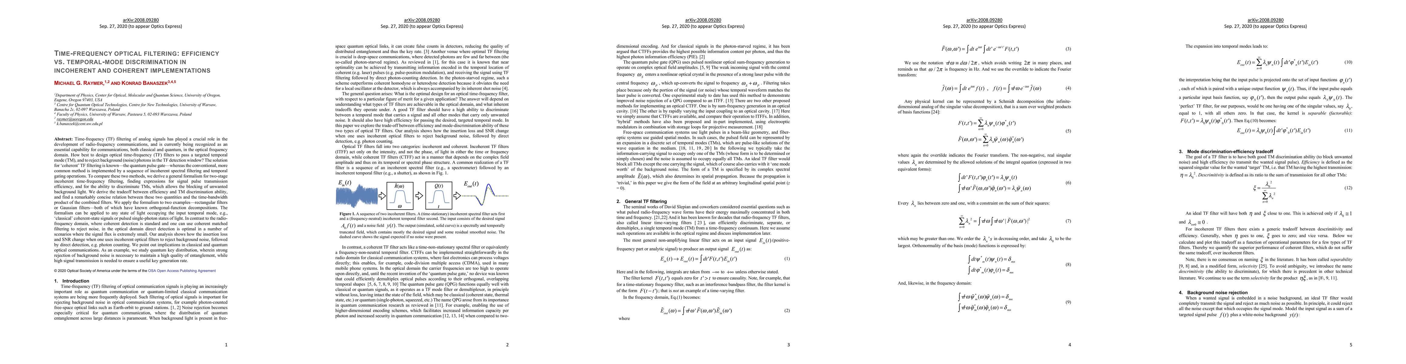 This paper investigates the efficiency and temporal-mode discrimination in optical time-frequency filtering, comparing coherent methods like the quantum pulse gate to incoherent methods involving spectral and temporal gating. It provides a formalism for the latter, revealing a tradeoff between efficiency and discrimination ability linked to the time-bandwidth product, with implications for both classical and quantum optical communications, such as quantum key distribution.