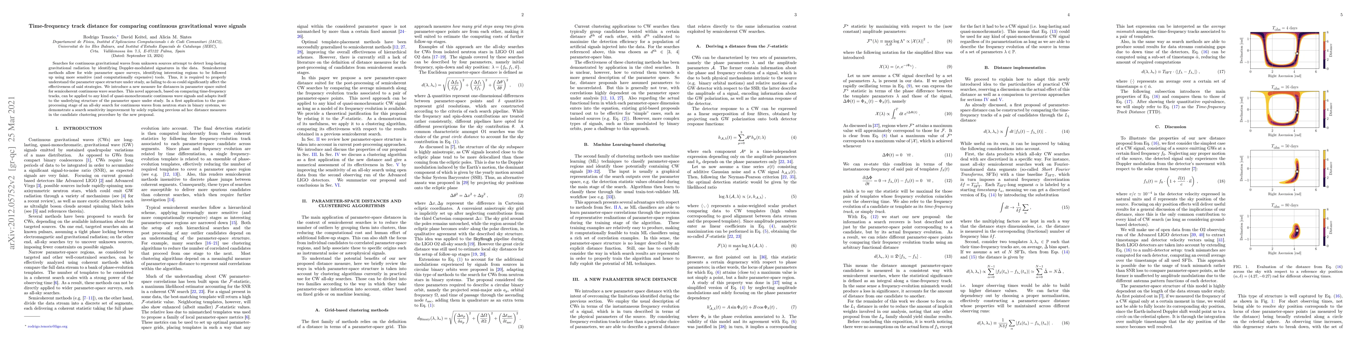 Searches for continuous gravitational waves from unknown sources attempt to detect long-lasting gravitational radiation by identifying Doppler-modulated signatures in the data. Semicoherent methods allow for wide parameter space surveys, identifying interesting regions to be followed up using more sensitive (and computationally expensive) tools. Thus, it is required to properly understand the parameter space structure under study, as failing to do so could significantly affect the effectiveness of said strategies. We introduce a new measure for distances in parameter space suited for semicoherent continuous wave searches. This novel approach, based on comparing time-frequency tracks, can be applied to any kind of quasi-monochromatic continuous wave signals and adapts itself to the underlying structure of the parameter space under study. In a first application to the post-processing stage of an all-sky search for continuous waves from neutron stars in binary systems, we demonstrate a search sensitivity improvement by solely replacing previous ad hoc distance measures in the candidate clustering procedure by the new proposal.