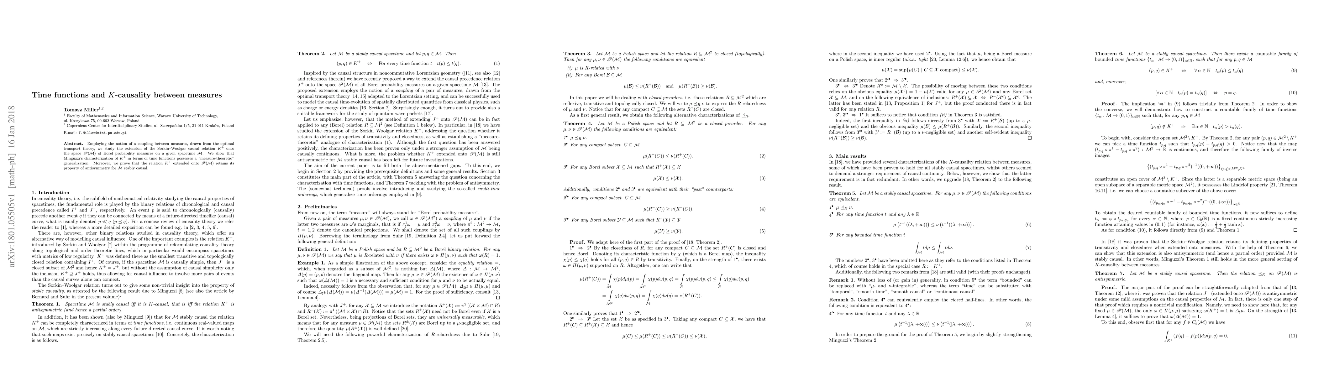 Employing the notion of a coupling between measures, drawn from the optimal transport theory, we study the extension of the Sorkin-Woolgar causal relation $K^+$ onto the space $\mathscr{P}(\mathcal{M})$ of Borel probability measures on a given spacetime $\mathcal{M}$. We show that Minguzzi's characterization of $K^+$ in terms of time functions possesses a "measure-theoretic" generalization. Moreover, we prove that the relation $K^+$ extended onto $\mathscr{P}(\mathcal{M})$ retains its property of antisymmetry for $\mathcal{M}$ stably causal.