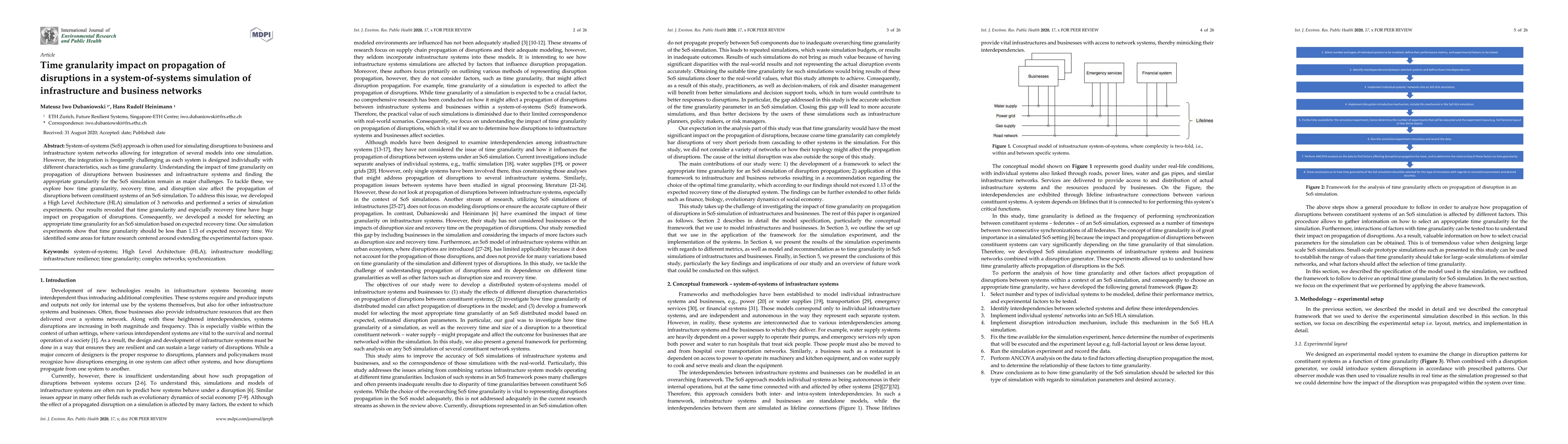 This paper investigates how time granularity influences the propagation of disruptions in a system-of-systems simulation integrating business and infrastructure networks. The study found that time granularity, particularly recovery time, significantly affects disruption propagation, leading to a model for selecting optimal granularity based on expected recovery time.
