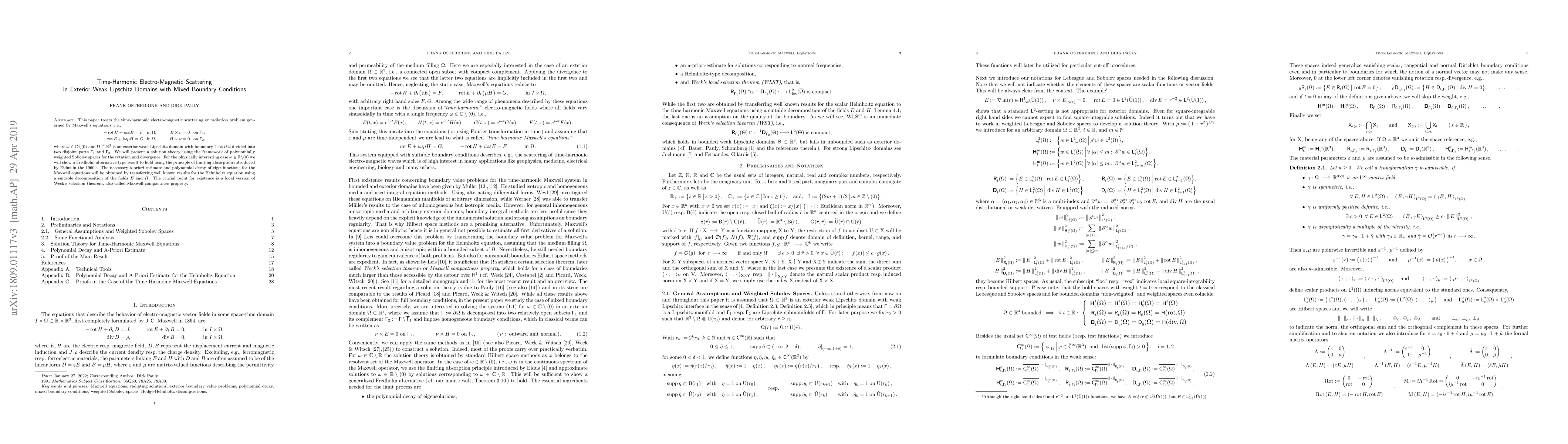 This paper develops a solution theory for time-harmonic electromagnetic scattering in exterior weak Lipschitz domains with mixed boundary conditions, employing polynomially weighted Sobolev spaces and proving a Fredholm alternative result via Eidus' principle of limiting absorption. It leverages known Helmholtz equation results and Weck's selection theorem for existence.