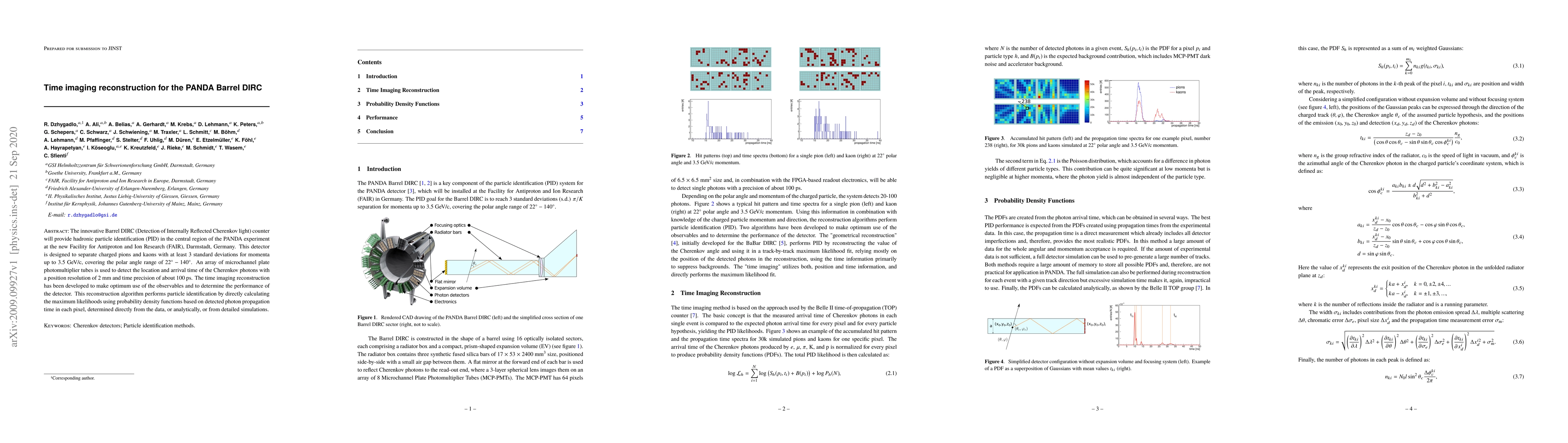 The innovative Barrel DIRC (Detection of Internally Reflected Cherenkov light) counter will provide hadronic particle identification (PID) in the central region of the PANDA experiment at the new Facility for Antiproton and Ion Research (FAIR), Darmstadt, Germany. This detector is designed to separate charged pions and kaons with at least 3 standard deviations for momenta up to 3.5 GeV/c, covering the polar angle range of 22$^{\circ}$-140$^{\circ}$. An array of microchannel plate photomultiplier tubes is used to detect the location and arrival time of the Cherenkov photons with a position resolution of 2 mm and time precision of about 100 ps. The time imaging reconstruction has been developed to make optimum use of the observables and to determine the performance of the detector. This reconstruction algorithm performs particle identification by directly calculating the maximum likelihoods using probability density functions based on detected photon propagation time in each pixel, determined directly from the data, or analytically, or from detailed simulations.
