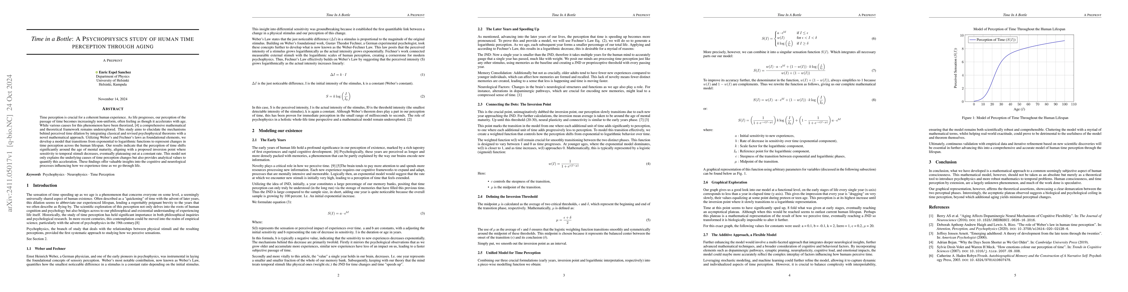 This study develops a mathematical model to explain changes in human time perception with aging, using classical psychophysics and a novel approach to transition from exponential to logarithmic functions. The findings suggest a significant shift in time perception around mental maturity, with implications for understanding cognitive and neurological influences on our experience of time.