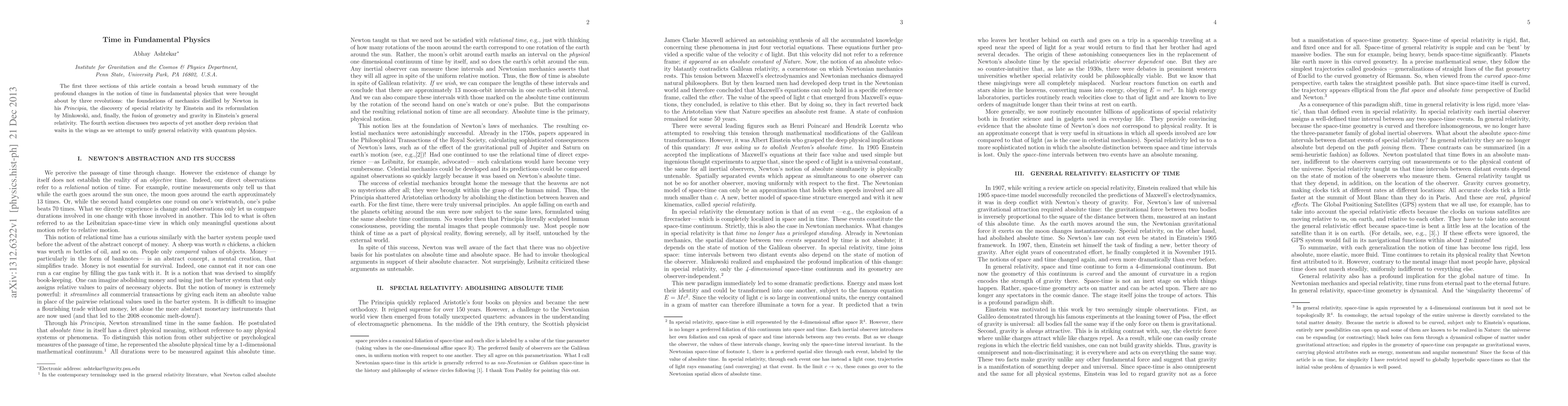 The first three sections of this article contain a broad brush summary of the profound changes in the notion of time in fundamental physics that were brought about by three revolutions: the foundations of mechanics distilled by Newton in his Principia, the discovery of special relativity by Einstein and its reformulation by Minkowski, and, finally, the fusion of geometry and gravity in Einstein's general relativity. The fourth section discusses two aspects of yet another deep revision that waits in the wings as we attempt to unify general relativity with quantum physics.