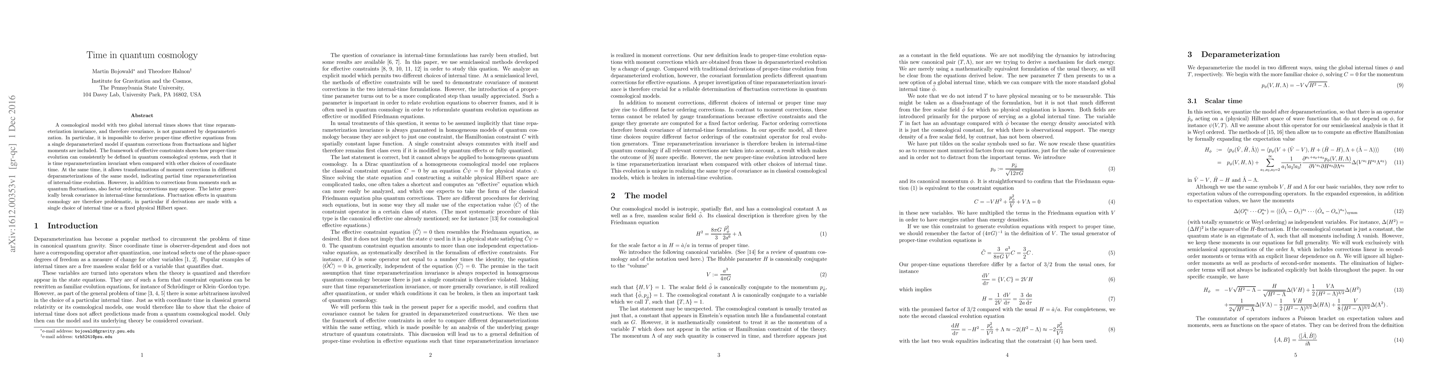 A cosmological model with two global internal times shows that time reparameterization invariance, and therefore covariance, is not guaranteed by deparameterization. In particular, it is impossible to derive proper-time effective equations from a single deparameterized model if quantum corrections from fluctuations and higher moments are included. The framework of effective constraints shows how proper-time evolution can consistently be defined in quantum cosmological systems, such that it is time reparameterization invariant when compared with other choices of coordinate time. At the same time, it allows transformations of moment corrections in different deparameterizations of the same model, indicating partial time reparameterization of internal-time evolution. However, in addition to corrections from moments such as quantum fluctuations, also factor ordering corrections may appear. The latter generically break covariance in internal-time formulations. Fluctuation effects in quantum cosmology are therefore problematic, in particular if derivations are made with a single choice of internal time or a fixed physical Hilbert space.