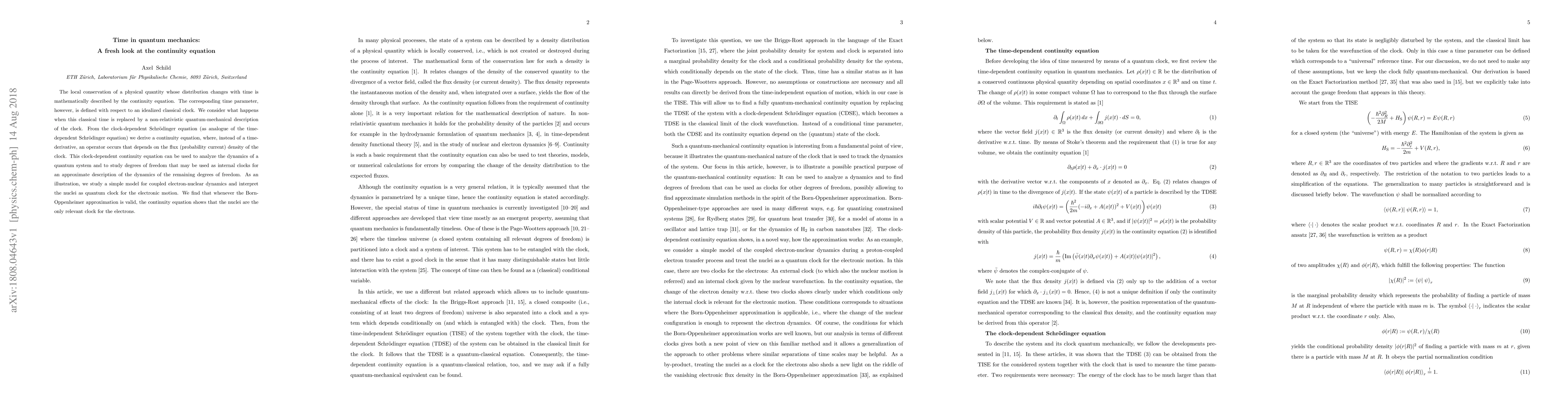 This research derives a new continuity equation in quantum mechanics, replacing classical time with a quantum-mechanical clock description. The equation is applied to a model of coupled electron-nuclear dynamics, showing nuclei can serve as a quantum clock for electron motion, validating the Born-Oppenheimer approximation.