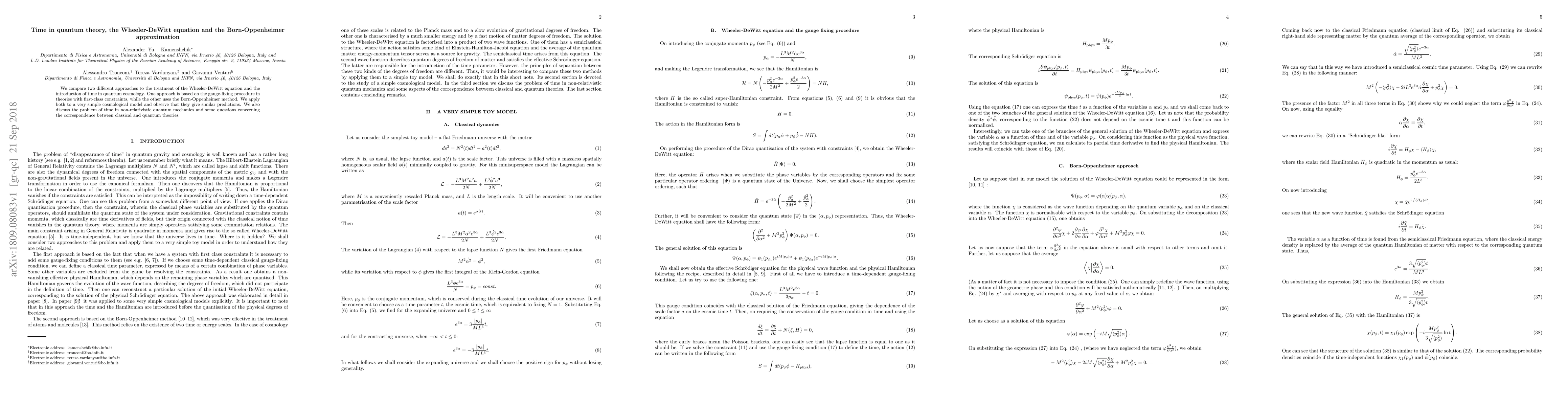 We compare two different approaches to the treatment of the Wheeler-DeWitt equation and the introduction of time in quantum cosmology. One approach is based on the gauge-fixing procedure in theories with first-class constraints, while the other uses the Born-Oppenheimer method. We apply both to a very simple cosmological model and observe that they give similar predictions. We also discuss the problem of time in non-relativistic quantum mechanics and some questions concerning the correspondence between classical and quantum theories.