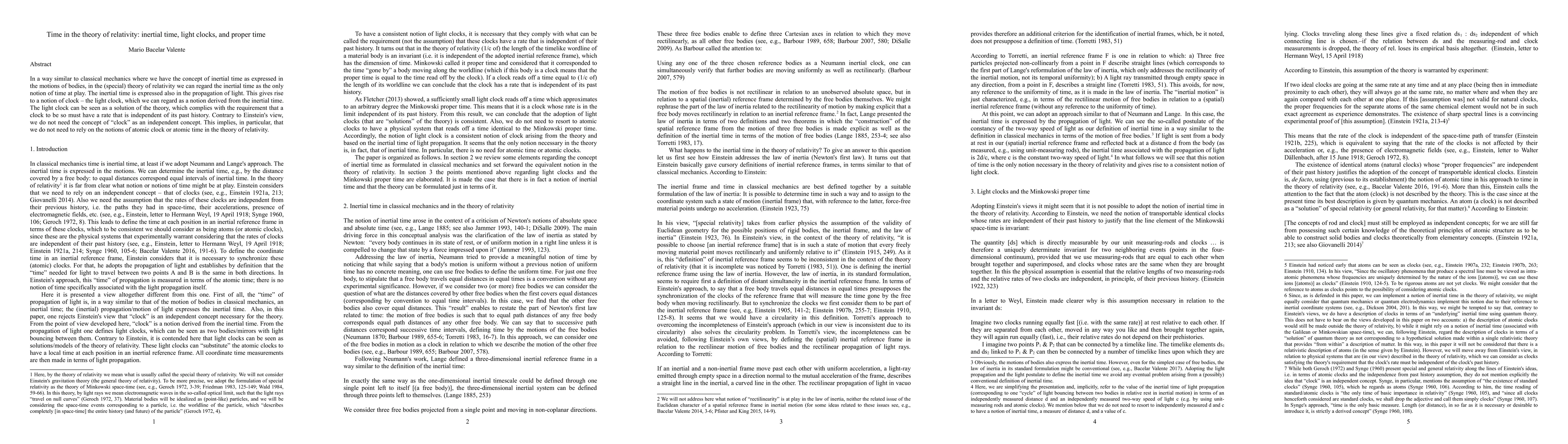 Summary: This paper discusses the concept of inertial time in the theory of relativity, emphasizing its role in the propagation of light and the functioning of light clocks. It argues against the necessity of independent clock concepts like atomic clocks, asserting that inertial time alone suffices.
