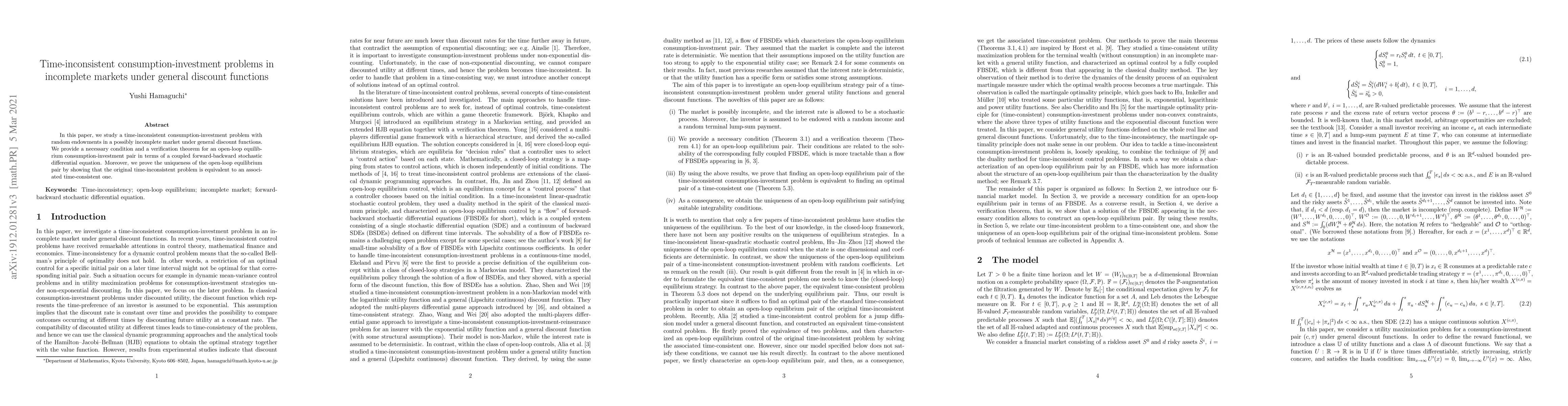 This paper investigates time-inconsistent consumption-investment decisions in incomplete markets with general discount functions, providing a necessary condition and verification theorem for an open-loop equilibrium via a forward-backward stochastic differential equation, and proving the uniqueness of this equilibrium by linking it to a time-consistent problem.