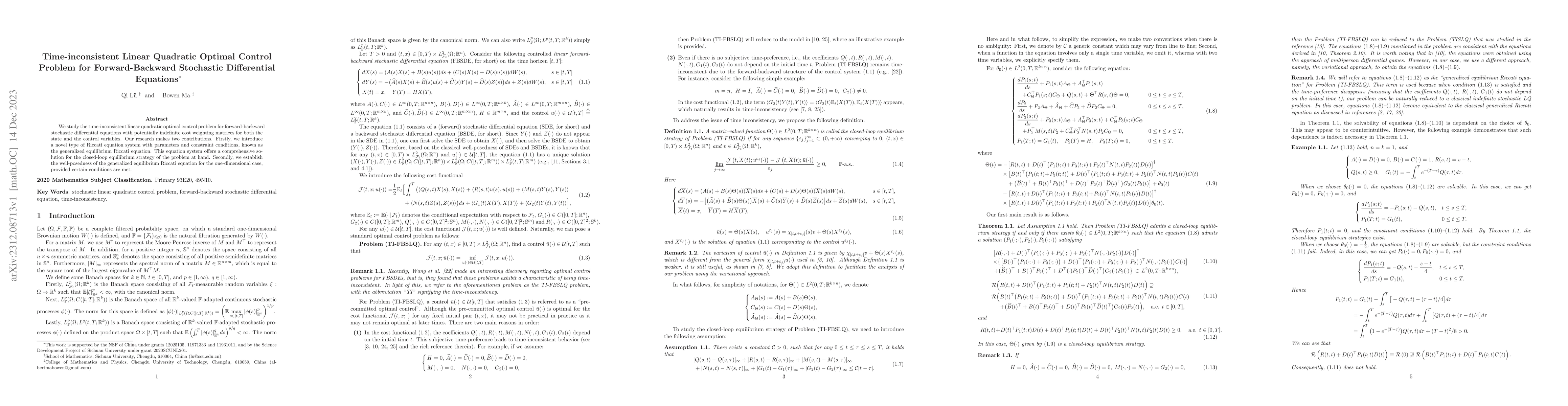 We study the time-inconsistent linear quadratic optimal control problem for forward-backward stochastic differential equations with potentially indefinite cost weighting matrices for both the state and the control variables. Our research makes two contributions. Firstly, we introduce a novel type of Riccati equation system with parameters and constraint conditions, known as the generalized equilibrium Riccati equation. This equation system offers a comprehensive solution for the closed-loop equilibrium strategy of the problem at hand. Secondly, we establish the well-posedness of the generalized equilibrium Riccati equation for the one-dimensional case, provided certain conditions are met.
