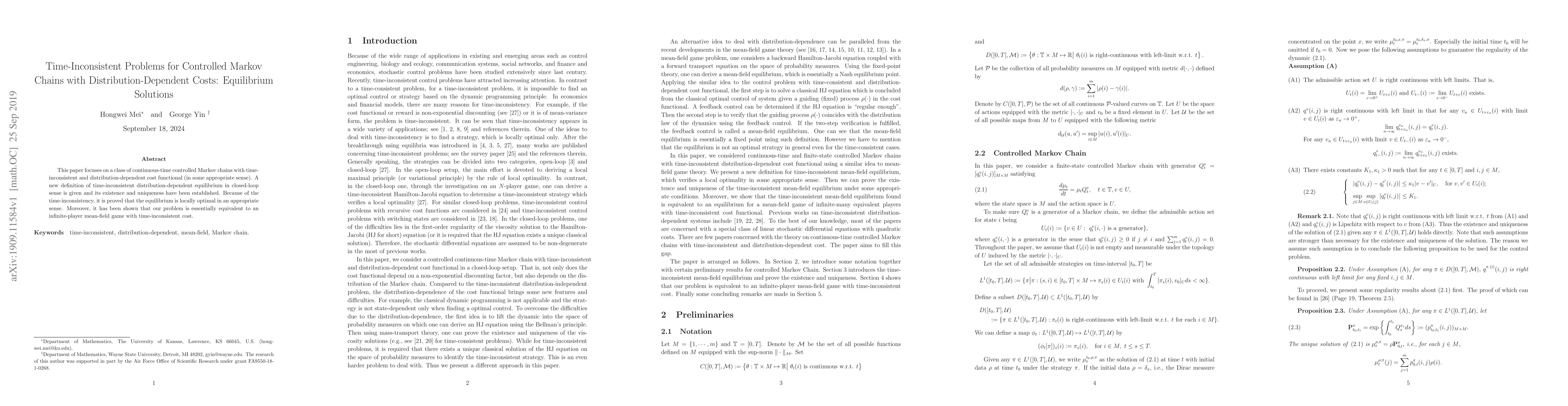 This paper introduces a new definition of time-inconsistent distribution-dependent equilibrium for continuous-time controlled Markov chains and proves its existence and uniqueness. It demonstrates that the equilibrium is locally optimal due to time-inconsistency and relates the problem to an infinite-player mean-field game.