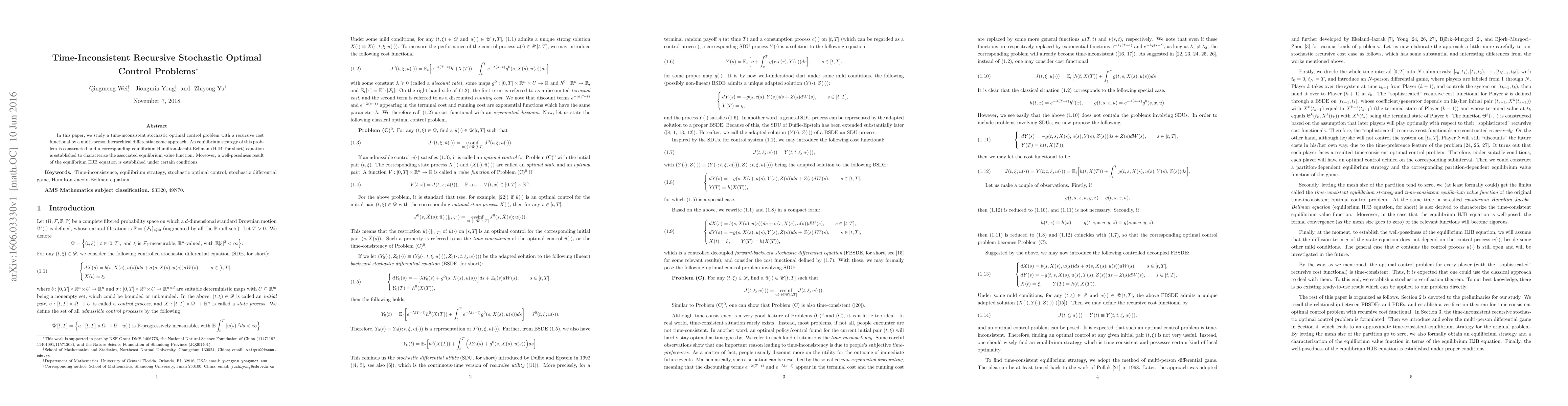This paper investigates time-inconsistent stochastic optimal control using a multi-person hierarchical differential game approach. It constructs an equilibrium strategy and establishes an equilibrium Hamilton-Jacobi-Bellman equation to characterize the equilibrium value function, along with proving its well-posedness under specific conditions.