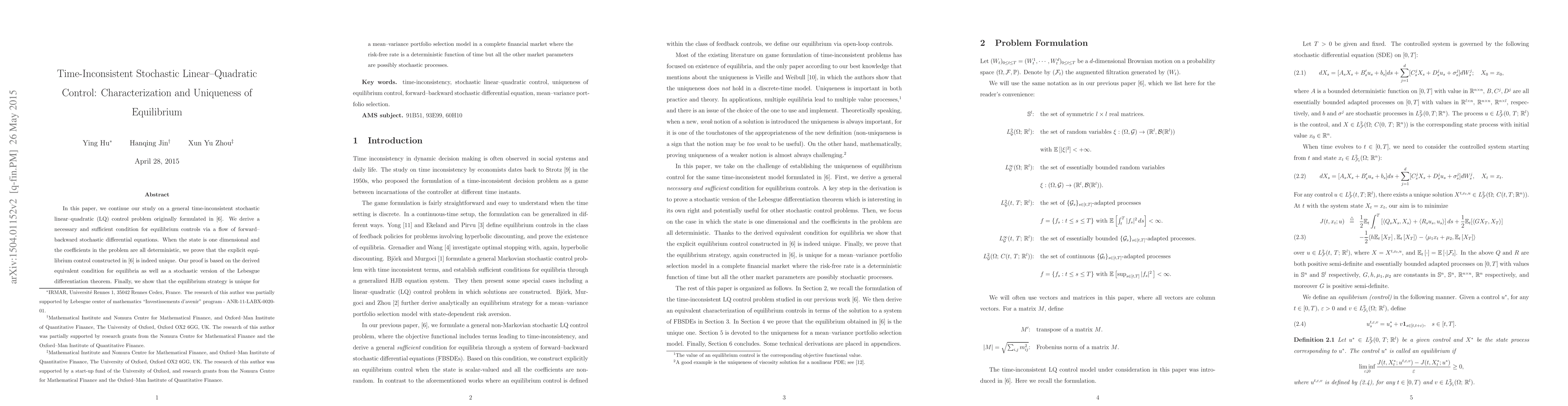 This paper investigates a time-inconsistent stochastic linear-quadratic control problem, deriving a necessary and sufficient condition for equilibrium controls through forward-backward stochastic differential equations. It proves the uniqueness of an explicit equilibrium control under deterministic conditions and extends the result to a mean-variance portfolio selection model in a financial market with stochastic parameters.