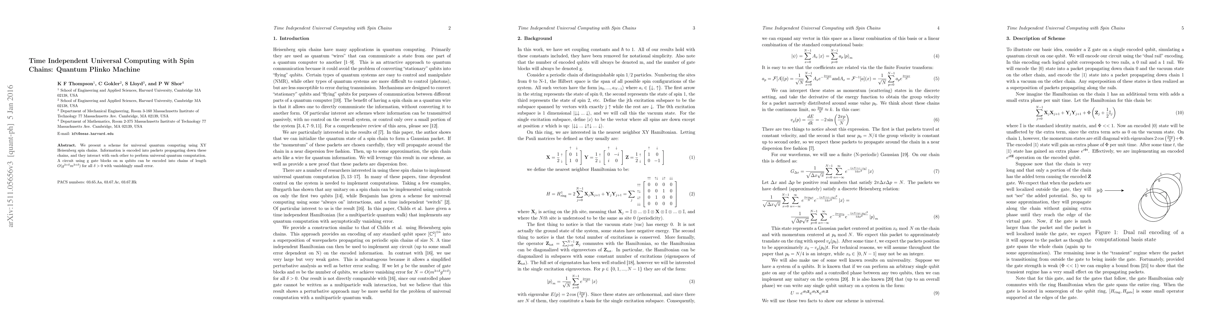 This paper proposes a universal quantum computing scheme using XY Heisenberg spin chains, where quantum information is encoded into packets that propagate and interact to perform computations. The scheme requires spin chains of length $O(g^{3+\delta} m^{3+\delta})$ for all $\delta >0$, achieving near-zero error.
