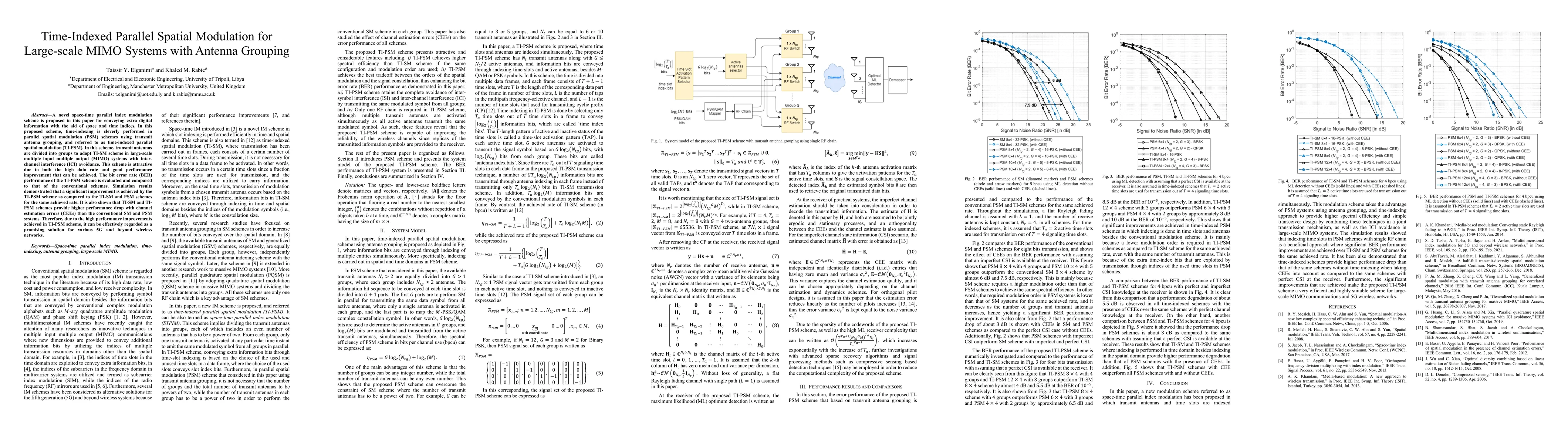This paper proposes a time-indexed parallel spatial modulation (TI-PSM) scheme for large-scale MIMO systems, which divides transmit antennas into groups to enhance data rates and mitigate inter-channel interference. Simulation results show significant performance improvements over conventional schemes, making TI-PSM a promising solution for 5G and beyond wireless networks.