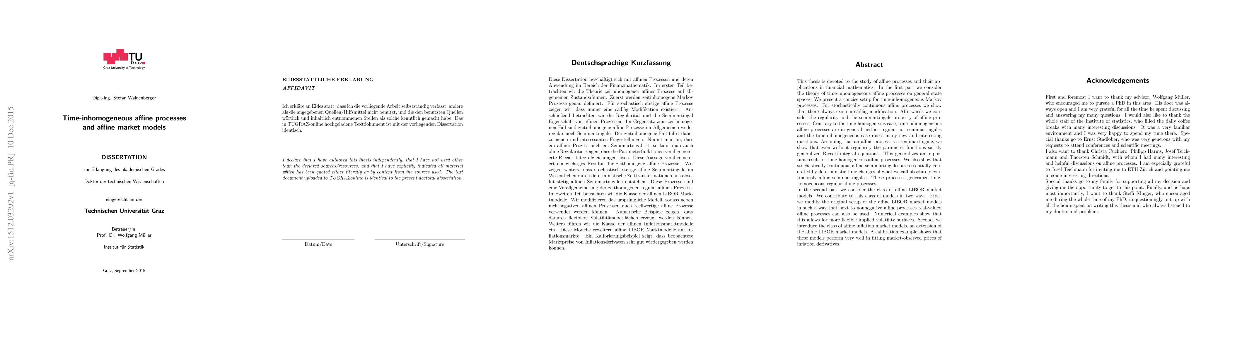 This thesis is devoted to the study of affine processes and their applications in financial mathematics. In the first part we consider the theory of time-inhomogeneous affine processes on general state spaces. We present a concise setup for time-inhomogeneous Markov processes. For stochastically continuous affine processes we show that there always exists a c\`adl\`ag modification. Afterwards we consider the regularity and the semimartingale property of affine processes. Contrary to the time-homogeneous case, time-inhomogeneous affine processes are in general neither regular nor semimartingales and the time-inhomogeneous case raises many new and interesting questions. Assuming that an affine process is a semimartingale, we show that even without regularity the parameter functions satisfy generalized Riccati integral equations. This generalizes an important result for time-homogeneous affine processes. We also show that stochastically continuous affine semimartingales are essentially generated by deterministic time-changes of what we call absolutely continuously affine semimartingales. These processes generalize time-homogeneous regular affine processes. In the second part we consider the class of affine LIBOR market models. We contribute to this class of models in two ways. First, we modify the original setup of the affine LIBOR market models in such a way that next to nonnegative affine processes real-valued affine processes can also be used. Numerical examples show that this allows for more flexible implied volatility surfaces. Second, we introduce the class of affine inflation market models, an extension of the affine LIBOR market models. A calibration example shows that these models perform very well in fitting market-observed prices of inflation derivatives.