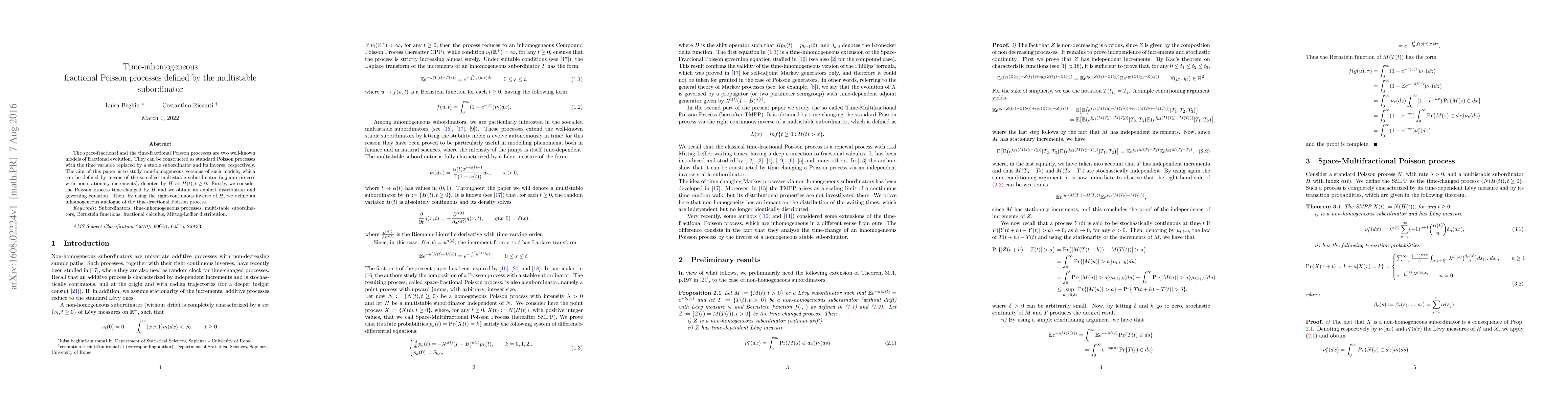 The space-fractional and the time-fractional Poisson processes are two well-known models of fractional evolution. They can be constructed as standard Poisson processes with the time variable replaced by a stable subordinator and its inverse, respectively. The aim of this paper is to study non-homogeneous versions of such models, which can be defined by means of the so-called multistable subordinator (a jump process with non-stationary increments), denoted by H. Firstly, we consider the Poisson process time-changed by H and we obtain its explicit distribution and governing equation. Then, by using the right-continuous inverse of H, we define an inhomogeneous analogue of the time-fractional Poisson process.