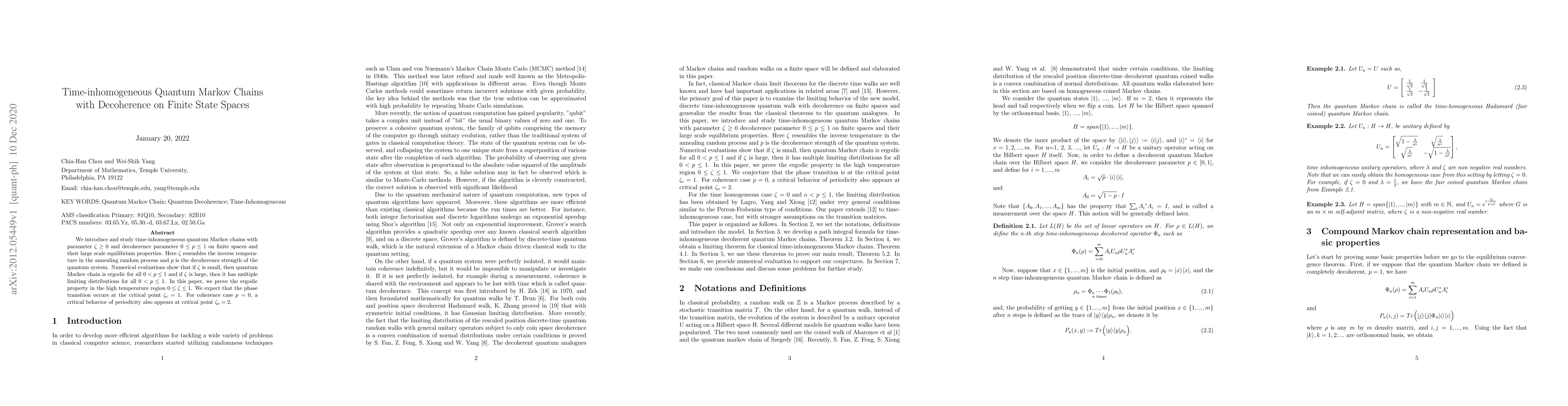 We introduce and study time-inhomogeneous quantum Markov chains with parameter $\zeta \ge 0$ and decoherence parameter $0 \leq p \leq 1$ on finite spaces and their large scale equilibrium properties. Here $\zeta$ resembles the inverse temperature in the annealing random process and $p$ is the decoherence strength of the quantum system. Numerical evaluations show that if $ \zeta$ is small, then quantum Markov chain is ergodic for all $0 < p \le 1$ and if $ \zeta $ is large, then it has multiple limiting distributions for all $0 < p \le 1$. In this paper, we prove the ergodic property in the high temperature region $0 \le \zeta \le 1$. We expect that the phase transition occurs at the critical point $\zeta_c=1$. For coherence case $p=0$, a critical behavior of periodicity also appears at critical point $\zeta_o=2$.