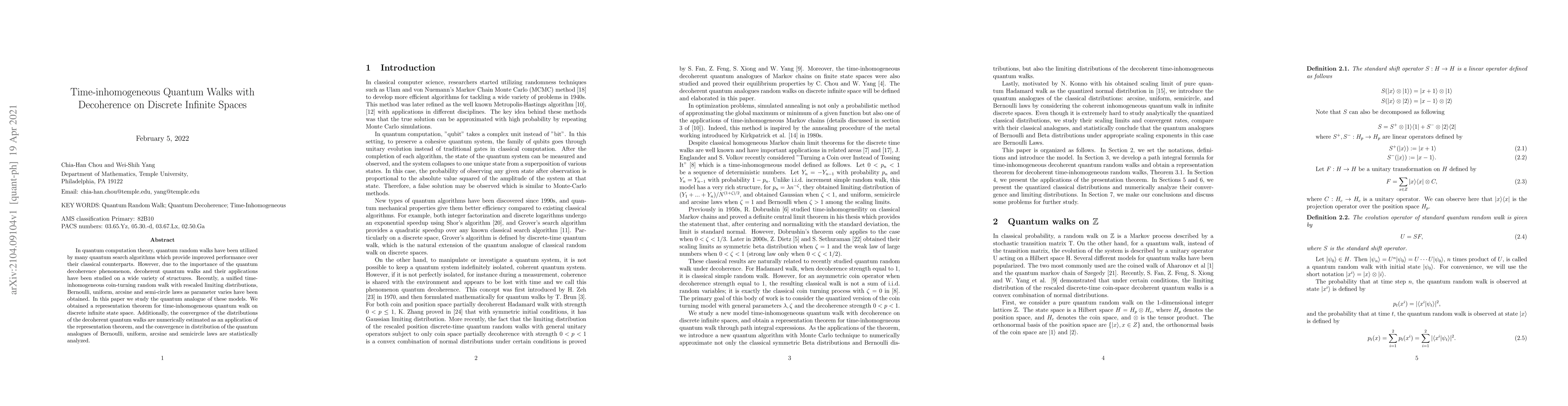 This paper investigates the time-inhomogeneous quantum walk in the presence of decoherence on discrete infinite spaces. It presents a representation theorem for these quantum walks and statistically analyzes their convergence to Bernoulli, uniform, arcsine, and semi-circle laws.
