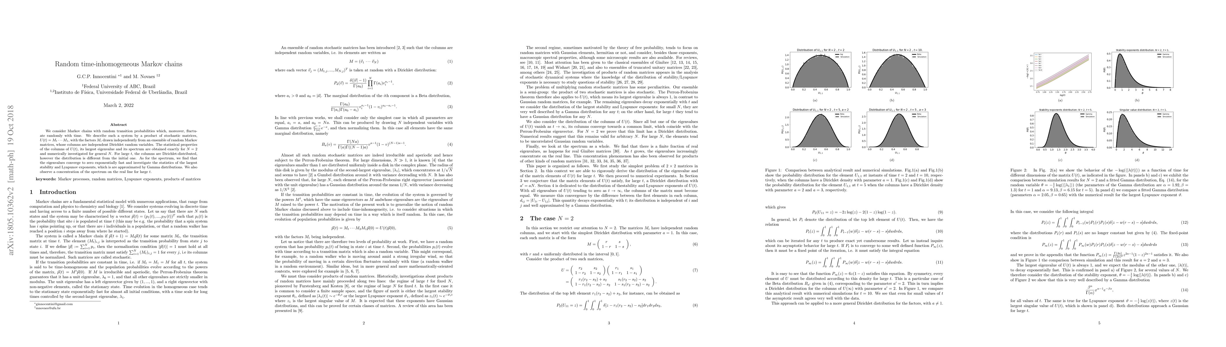 We consider Markov chains with random transition probabilities which, moreover, fluctuate randomly with time. We describe such a system by a product of stochastic matrices, $U(t)=M_t\cdots M_1$, with the factors $M_i$ drawn independently from an ensemble of random Markov matrices, whose columns are independent Dirichlet random variables. The statistical properties of the columns of $U(t)$, its largest eigenvalue and its spectrum are obtained exactly for $N=2$ and numerically investigated for general $N$. For large $t$, the columns are Dirichlet-distributed, however the distribution is different from the initial one. As for the spectrum, we find that the eigenvalues converge to zero exponentially fast and investigate the statistics of the largest Lyapunov exponent, which is well approximated the a Gamma distribution. We also observe a concentration of the spectrum on the real line for large $t$.