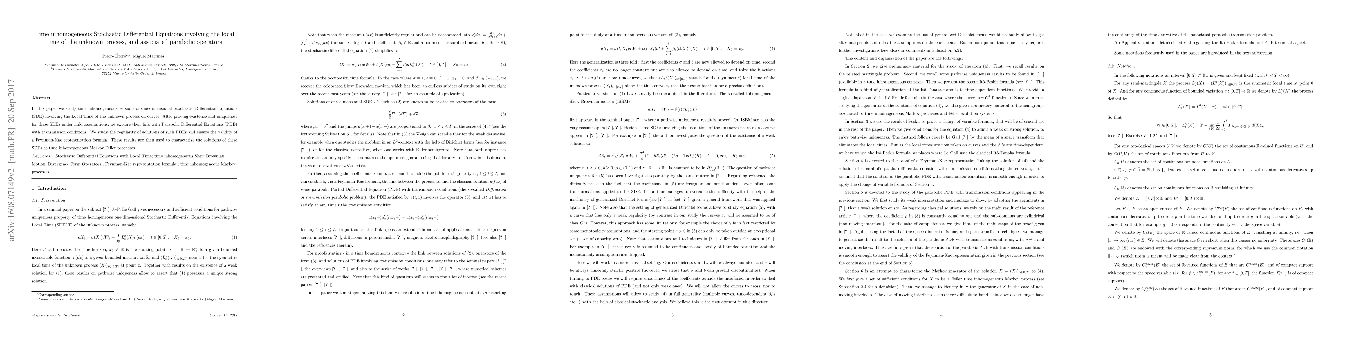 This paper studies time-inhomogeneous SDEs involving local time of an unknown process and its connection to parabolic PDEs with transmission conditions. It establishes a Feynman-Kac representation formula and characterizes solutions as time-inhomogeneous Markov Feller processes.