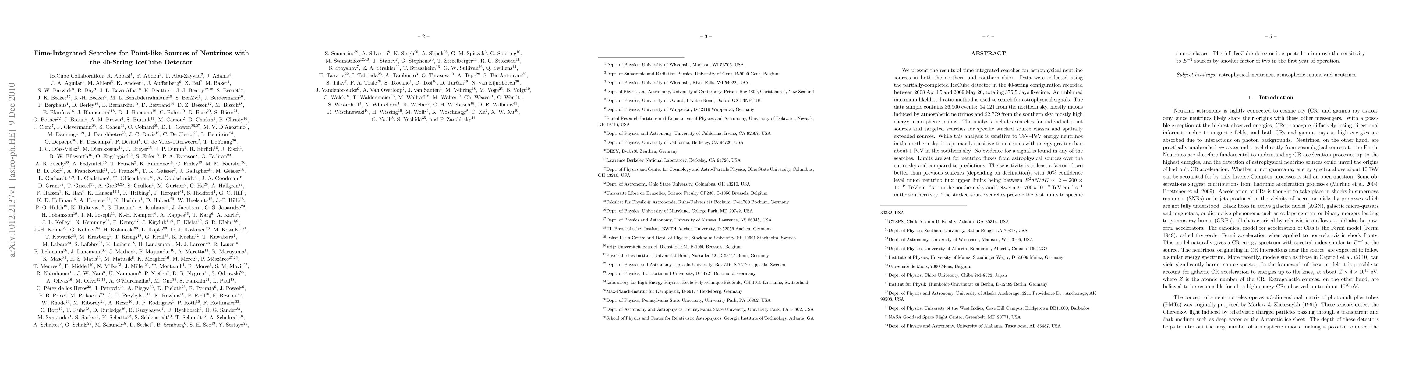 This study reports time-integrated searches for astrophysical neutrinos using the 40-string IceCube detector, finding no evidence for signals in either the northern or southern skies. The analysis sets improved limits on neutrino fluxes, with the best sensitivity in the southern sky.