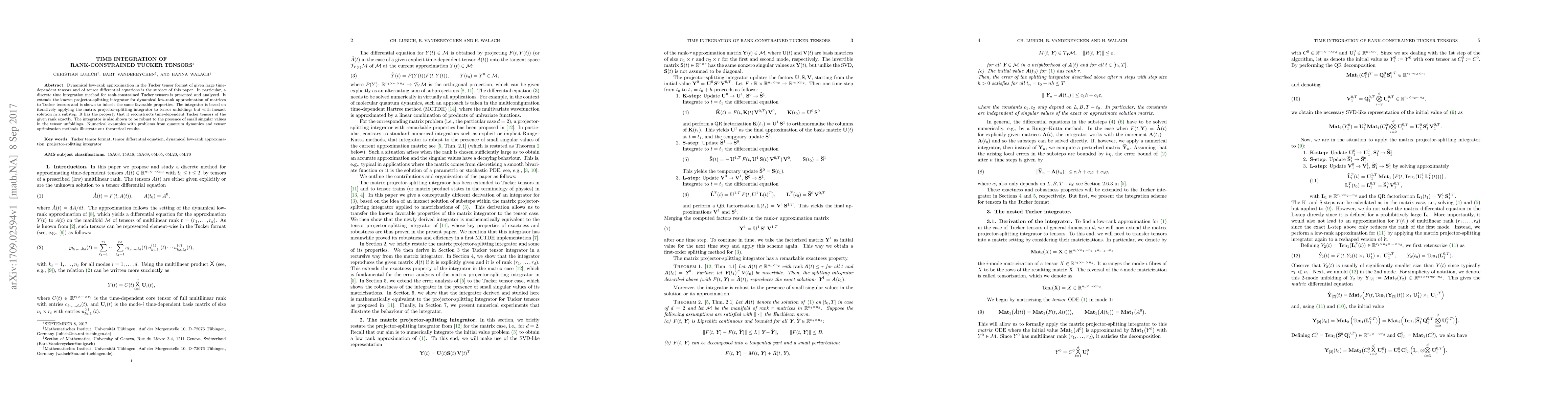 This paper presents a novel time integration method for rank-constrained Tucker tensors, extending matrix projector-splitting integrators to tensors. The method accurately reconstructs time-dependent tensors of specified rank and demonstrates robustness against small singular values, as shown through quantum dynamics and tensor optimization examples.