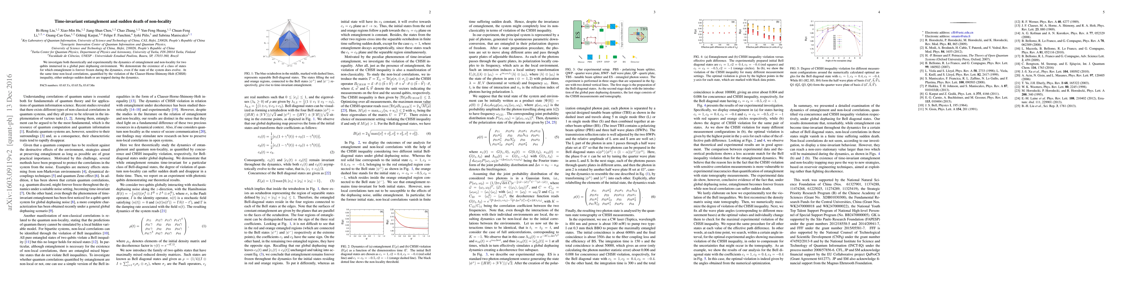 We investigate both theoretically and experimentally the dynamics of entanglement and non-locality for two qubits immersed in a global pure dephasing environment. We demonstrate the existence of a class of states for which entanglement is forever frozen during the dynamics, even if the state of the system does evolve. At the same time non-local correlations, quantified by the violation of the Clauser-Horne-Shimony-Holt (CHSH) inequality, either undergo sudden death or are trapped during the dynamics.