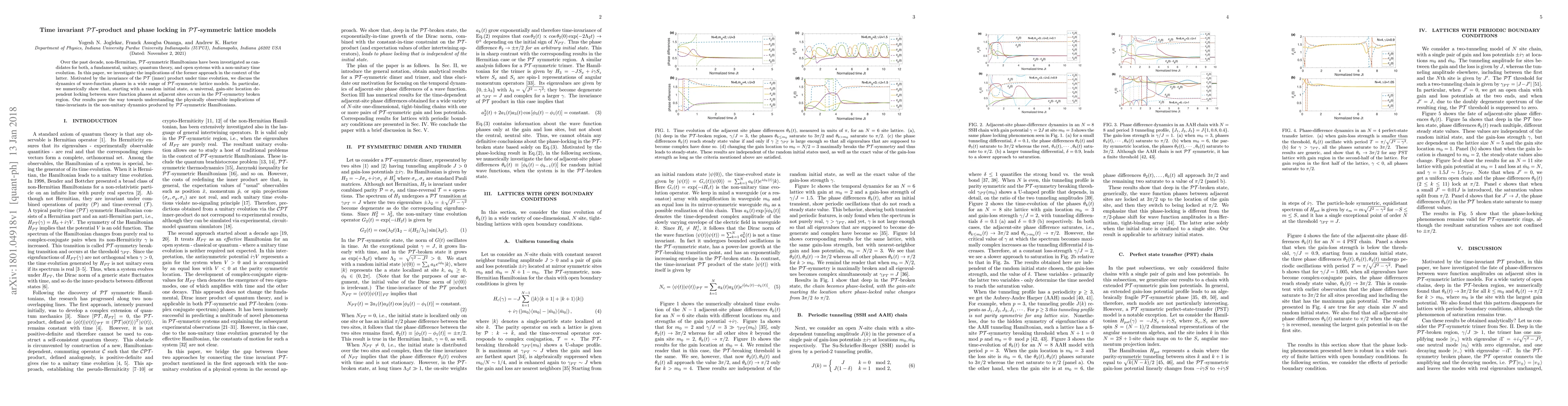 Over the past decade, non-Hermitian, $\mathcal{PT}$-symmetric Hamiltonians have been investigated as candidates for both, a fundamental, unitary, quantum theory, and open systems with a non-unitary time evolution. In this paper, we investigate the implications of the former approach in the context of the latter. Motivated by the invariance of the $\mathcal{PT}$ (inner) product under time evolution, we discuss the dynamics of wave-function phases in a wide range of $\mathcal{PT}$-symmetric lattice models. In particular, we numerically show that, starting with a random initial state, a universal, gain-site location dependent locking between wave function phases at adjacent sites occurs in the $\mathcal{PT}$-symmetry broken region. Our results pave the way towards understanding the physically observable implications of time-invariants in the non-unitary dynamics produced by $\mathcal{PT}$-symmetric Hamiltonians.