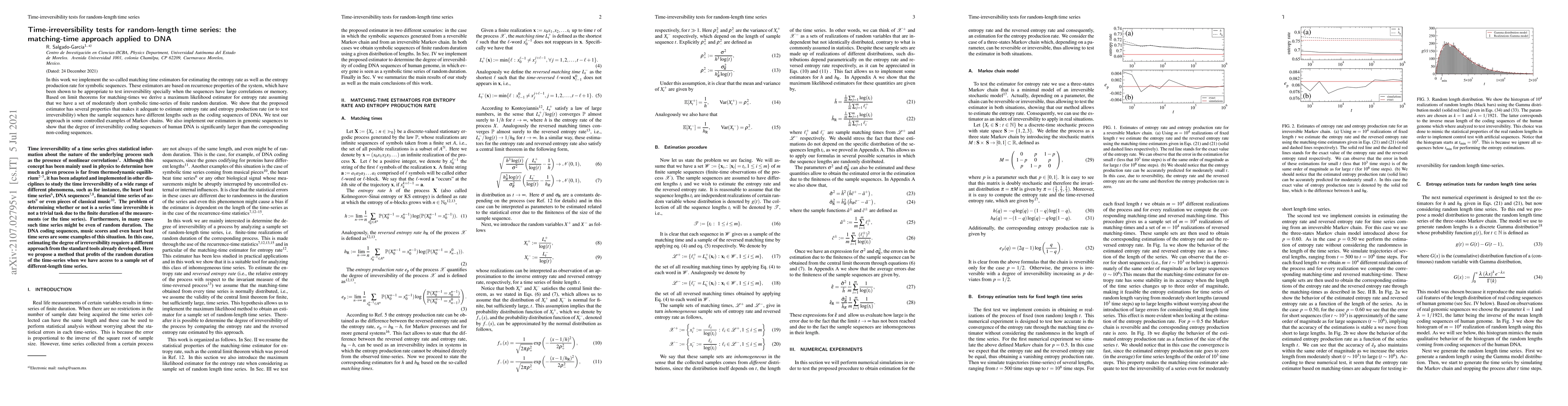This paper introduces matching time estimators to estimate entropy rates and test time-irreversibility in random-length time series, particularly applied to DNA sequences. The proposed method shows significant irreversibility in human DNA coding sequences compared to non-coding sequences.
