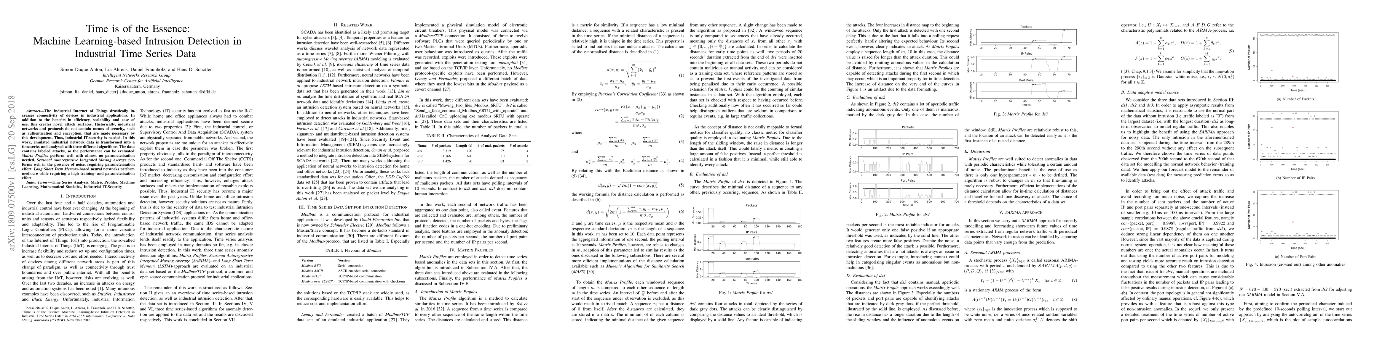 The Industrial Internet of Things drastically increases connectivity of devices in industrial applications. In addition to the benefits in efficiency, scalability and ease of use, this creates novel attack surfaces. Historically, industrial networks and protocols do not contain means of security, such as authentication and encryption, that are made necessary by this development. Thus, industrial IT-security is needed. In this work, emulated industrial network data is transformed into a time series and analysed with three different algorithms. The data contains labeled attacks, so the performance can be evaluated. Matrix Profiles perform well with almost no parameterisation needed. Seasonal Autoregressive Integrated Moving Average performs well in the presence of noise, requiring parameterisation effort. Long Short Term Memory-based neural networks perform mediocre while requiring a high training- and parameterisation effort.