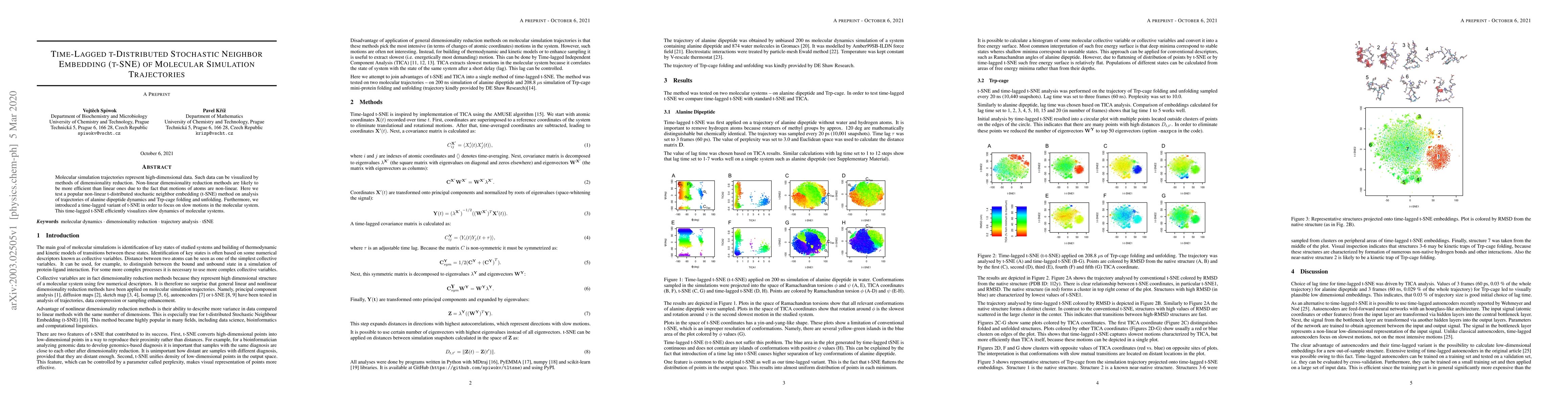 This paper applies a time-lagged variant of t-distributed stochastic neighbor embedding (t-SNE) to visualize slow dynamics in molecular simulation trajectories, specifically analyzing alanine dipeptide and Trp-cage folding/unfolding. The method enhances the visualization of non-linear, slow atomic motions.