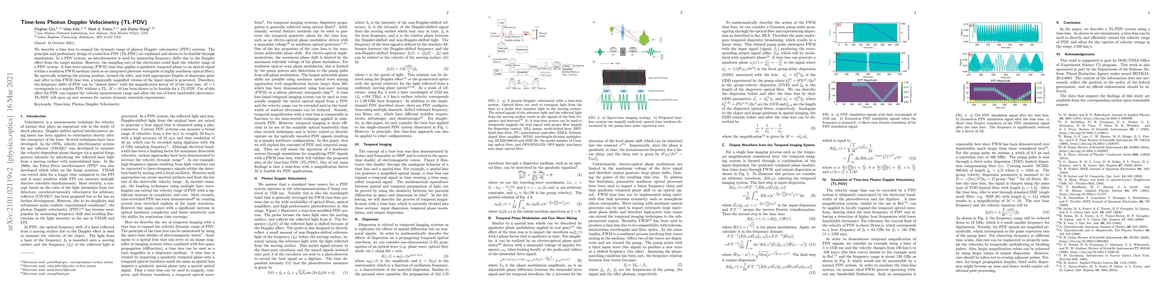 We describe a time lens to expand the dynamic range of photon Doppler velocimetry (PDV) systems. The principle and preliminary design of a time-lens PDV (TL-PDV) are explained and shown to be feasible through simulations. In a PDV system, an interferometer is used for measuring frequency shifts due to the Doppler effect from the target motion. However, the sampling rate of the electronics could limit the velocity range of a PDV system. A four-wave-mixing (FWM) time lens applies a quadratic temporal phase to an optical signal within a nonlinear FWM medium (such as an integrated photonic waveguide or highly nonlinear optical fiber). By spectrally isolating the mixing product, termed the idler, and with appropriate lengths of dispersion prior and after to this FWM time lens, a temporally magnified version of the input signal is generated. Therefore, the frequency shifts of PDV can be "slowed down" with the magnification factor $M$ of the time lens. $M=1$ corresponds to a regular PDV without a TL. $M=10$ has been shown to be feasible for a TL-PDV. Use of this effect for PDV can expand the velocity measurement range and allow the use of lower bandwidth electronics. TL-PDV will open up new avenues for various dynamic materials experiments.