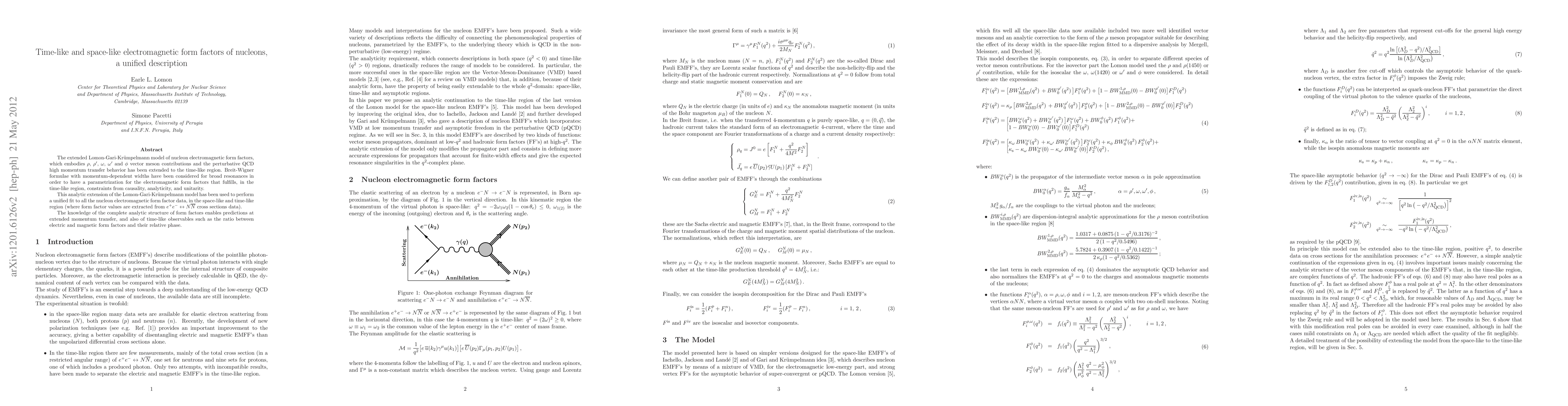 This paper extends the Lomon-Gari-Krümpelmann model to describe nucleon electromagnetic form factors in both space-like and time-like regions, incorporating vector meson contributions and perturbative QCD. The unified fit provides predictions for form factors and time-like observables, fulfilling constraints of causality, analyticity, and unitarity.