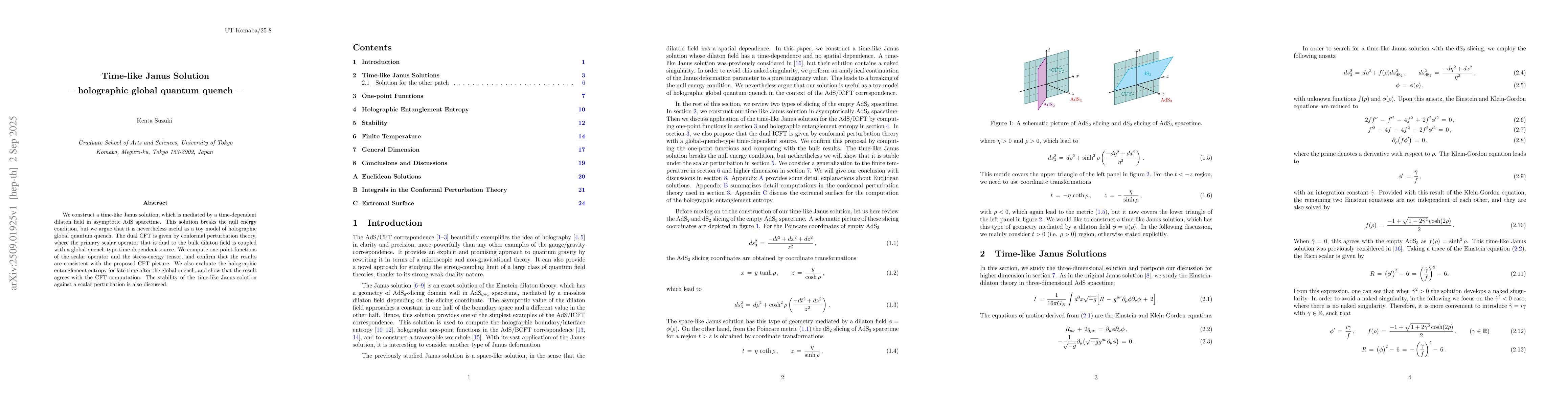 We construct a time-like Janus solution, which is mediated by a time-dependent dilaton field in asymptotic AdS spacetime. This solution breaks the null energy condition, but we argue that it is nevertheless useful as a toy model of holographic global quantum quench. The dual CFT is given by conformal perturbation theory, where the primary scalar operator that is dual to the bulk dilaton field is coupled with a global-quench-type time-dependent source. We compute one-point functions of the scalar operator and the stress-energy tensor, and confirm that the results are consistent with the proposed CFT picture. We also evaluate the holographic entanglement entropy for late time after the global quench, and show that the result agrees with the CFT computation. The stability of the time-like Janus solution against a scalar perturbation is also discussed.