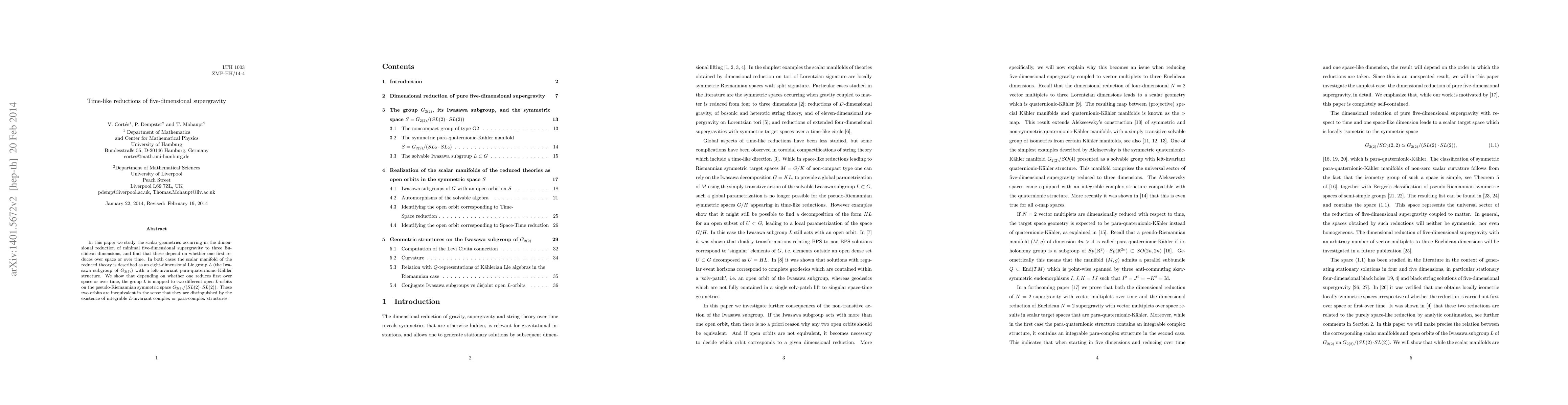 In this paper we study the scalar geometries occurring in the dimensional reduction of minimal five-dimensional supergravity to three Euclidean dimensions, and find that these depend on whether one first reduces over space or over time. In both cases the scalar manifold of the reduced theory is described as an eight-dimensional Lie group $L$ (the Iwasawa subgroup of $G_{2(2)}$) with a left-invariant para-quaternionic-K\"ahler structure. We show that depending on whether one reduces first over space or over time, the group $L$ is mapped to two different open $L$-orbits on the pseudo-Riemannian symmetric space $G_{2(2)}/(SL(2) \cdot SL(2))$. These two orbits are inequivalent in the sense that they are distinguished by the existence of integrable $L$-invariant complex or para-complex structures.
