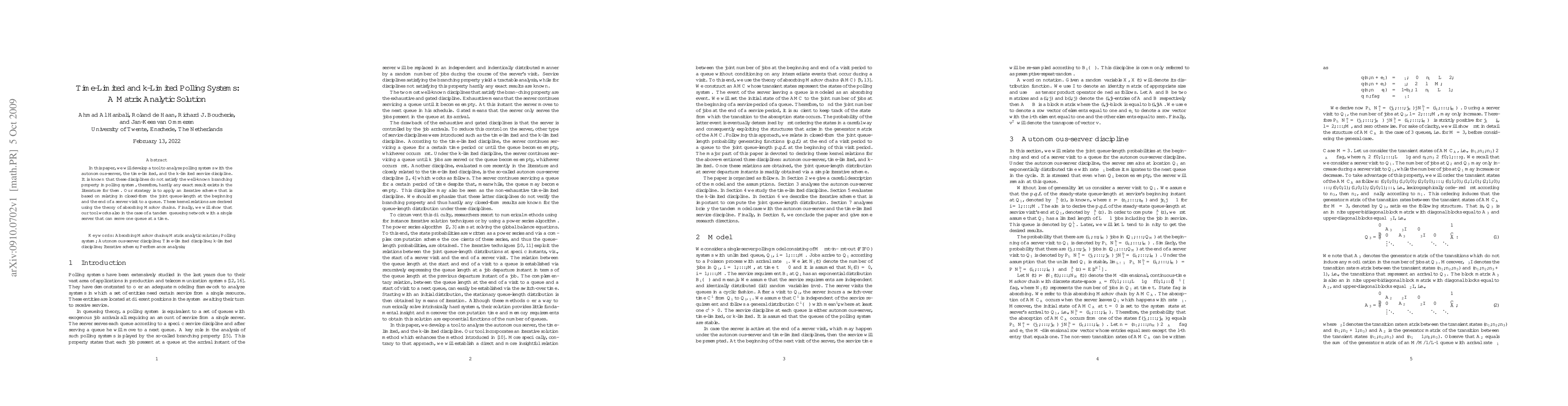 This paper develops a matrix analytic solution for analyzing polling systems with time-limited, k-limited, and autonomous-server service disciplines using an iterative scheme based on absorbing Markov chains. The proposed method also extends to tandem queueing networks with a single server.