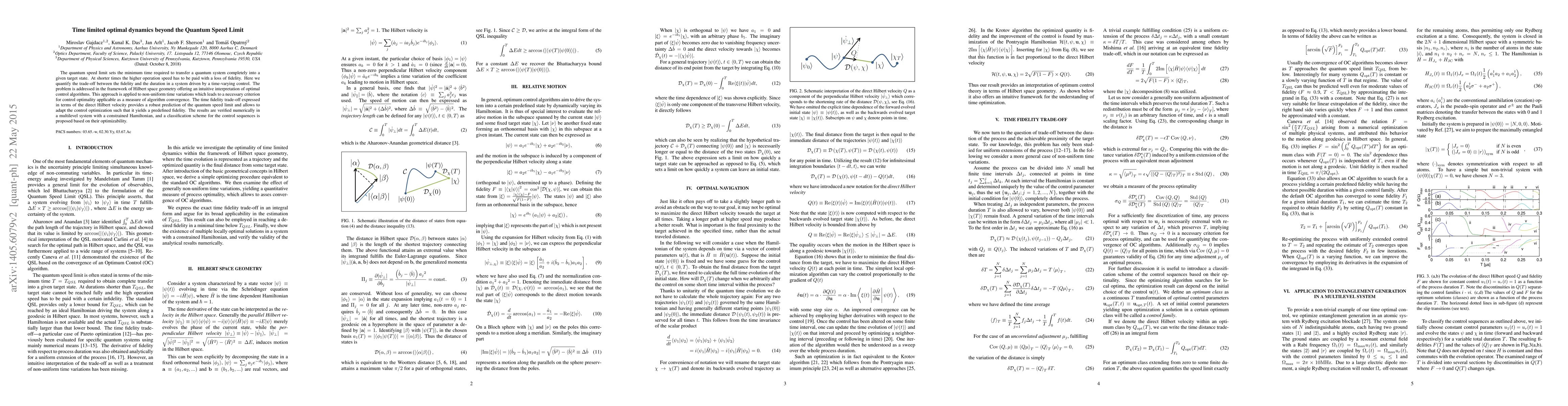 The quantum speed limit sets the minimum time required to transfer a quantum system completely into a given target state. At shorter times the higher operation speed has to be paid with a loss of fidelity. Here we quantify the trade-off between the fidelity and the duration in a system driven by a time-varying control. The problem is addressed in the framework of Hilbert space geometry offering an intuitive interpretation of optimal control algorithms. This approach is applied to non-uniform time variations which leads to a necessary criterion for control optimality applicable as a measure of algorithm convergence. The time fidelity trade-off expressed in terms of the direct Hilbert velocity provides a robust prediction of the quantum speed limit and allows to adapt the control optimization such that it yields a predefined fidelity. The results are verified numerically in a multilevel system with a constrained Hamiltonian, and a classification scheme for the control sequences is proposed based on their optimizability.