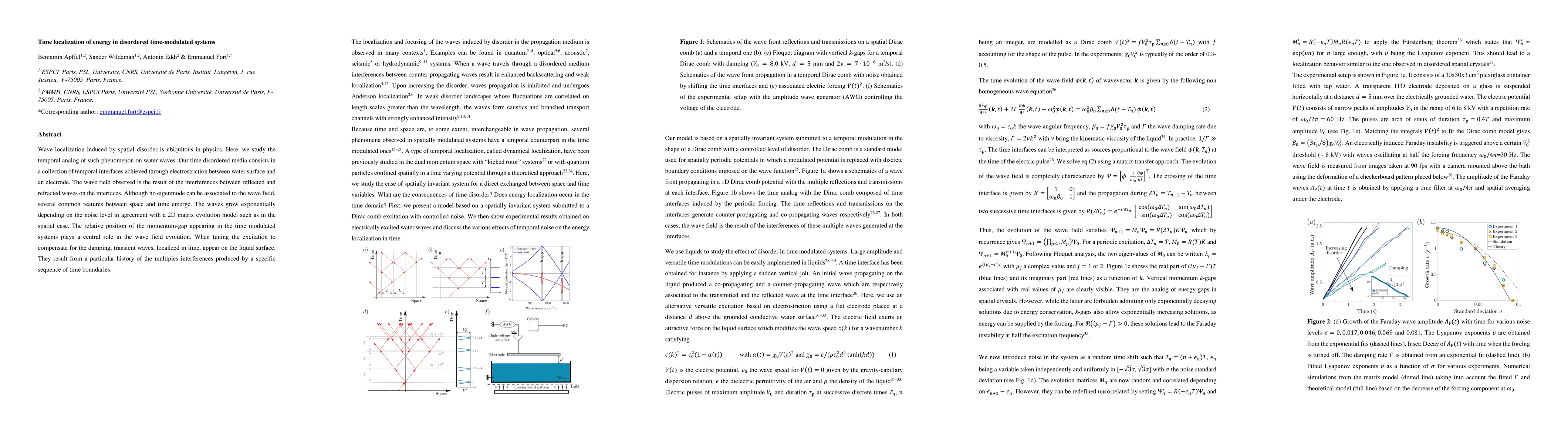 Researchers study time localization of energy in water waves with spatial disorder, finding exponential wave growth and localized transient waves that appear when excitation is tuned to compensate for damping.