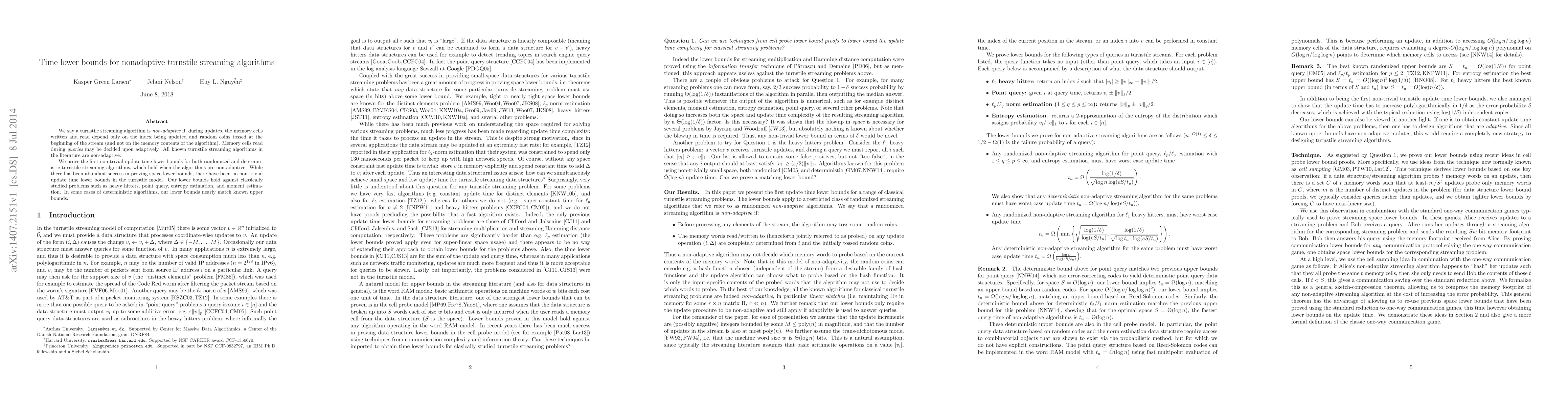 We say a turnstile streaming algorithm is "non-adaptive" if, during updates, the memory cells written and read depend only on the index being updated and random coins tossed at the beginning of the stream (and not on the memory contents of the algorithm). Memory cells read during queries may be decided upon adaptively. All known turnstile streaming algorithms in the literature are non-adaptive. We prove the first non-trivial update time lower bounds for both randomized and deterministic turnstile streaming algorithms, which hold when the algorithms are non-adaptive. While there has been abundant success in proving space lower bounds, there have been no non-trivial update time lower bounds in the turnstile model. Our lower bounds hold against classically studied problems such as heavy hitters, point query, entropy estimation, and moment estimation. In some cases of deterministic algorithms, our lower bounds nearly match known upper bounds.