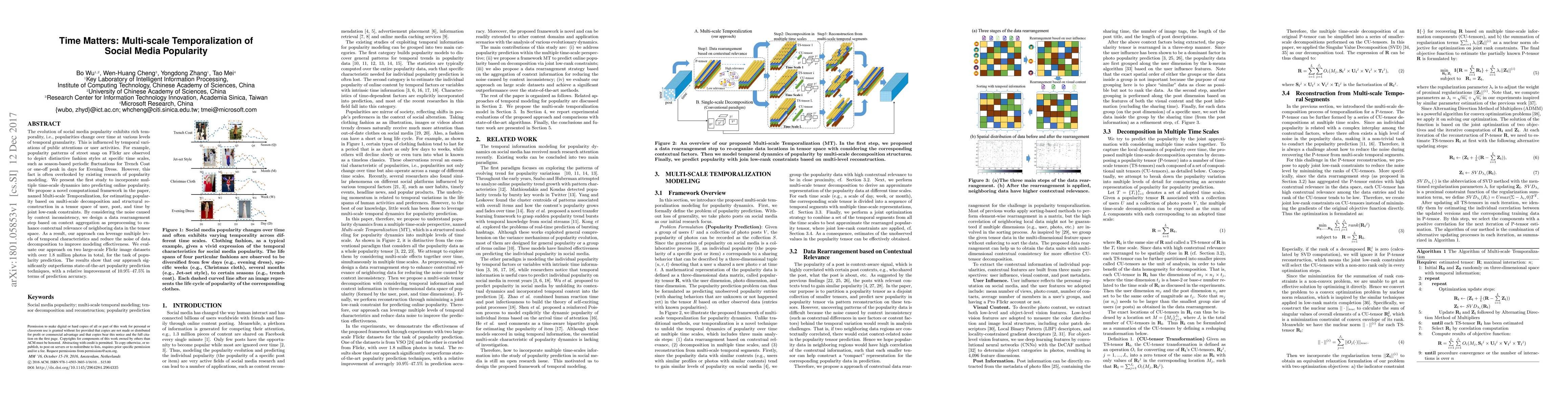 The evolution of social media popularity exhibits rich temporality, i.e., popularities change over time at various levels of temporal granularity. This is influenced by temporal variations of public attentions or user activities. For example, popularity patterns of street snap on Flickr are observed to depict distinctive fashion styles at specific time scales, such as season-based periodic fluctuations for Trench Coat or one-off peak in days for Evening Dress. However, this fact is often overlooked by existing research of popularity modeling. We present the first study to incorporate multiple time-scale dynamics into predicting online popularity. We propose a novel computational framework in the paper, named Multi-scale Temporalization, for estimating popularity based on multi-scale decomposition and structural reconstruction in a tensor space of user, post, and time by joint low-rank constraints. By considering the noise caused by context inconsistency, we design a data rearrangement step based on context aggregation as preprocessing to enhance contextual relevance of neighboring data in the tensor space. As a result, our approach can leverage multiple levels of temporal characteristics and reduce the noise of data decomposition to improve modeling effectiveness. We evaluate our approach on two large-scale Flickr image datasets with over 1.8 million photos in total, for the task of popularity prediction. The results show that our approach significantly outperforms state-of-the-art popularity prediction techniques, with a relative improvement of 10.9%-47.5% in terms of prediction accuracy.