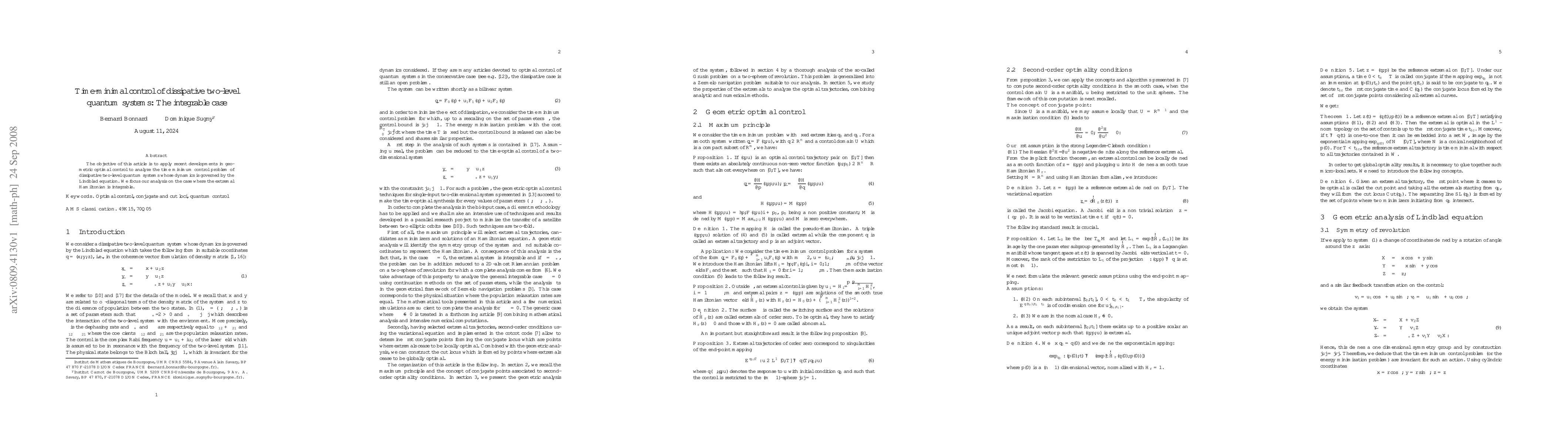 This paper explores the time-minimal control of dissipative two-level quantum systems using geometric optimal control, specifically focusing on integrable Hamiltonian dynamics described by the Lindblad equation. The study aims to determine the control strategies that minimize the time required for system transitions.