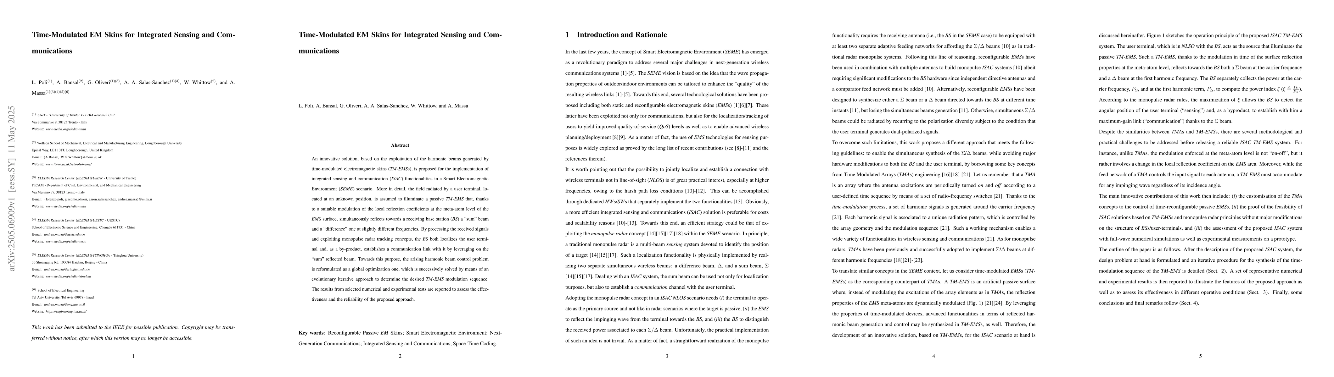 The paper presents a time-modulated electromagnetic skin (TM-EMS)-based approach for integrated sensing and communication (ISAC), reformulating harmonic beam control as a global optimization problem and solving it via an evolutionary iterative method.