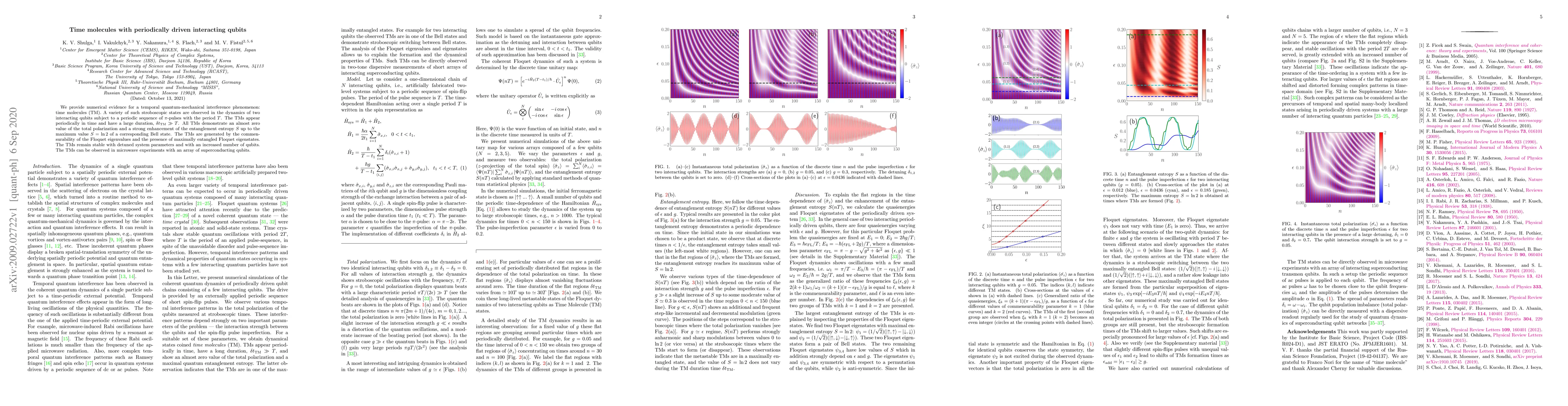 We provide numerical evidence for a temporal quantum-mechanical interference phenomenon: time molecules (TM). A variety of such stroboscopic states are observed in the dynamics of two interacting qubits subject to a periodic sequence of $\pi$-pulses with the period $T$. The TMs appear periodically in time and have a large duration, $\delta t_\mathrm{TM} \gg T$. All TMs demonstrate an almost zero value of the total polarization and a strong enhancement of the entanglement entropy $S$ up to the maximum value $S=\ln 2$ of a corresponding Bell state. The TMs are generated by the commensurability of the Floquet eigenvalues and the presence of maximally entangled Floquet eigenstates. The TMs remain stable with detuned system parameters and with an increased number of qubits. The TMs can be observed in microwave experiments with an array of superconducting qubits.