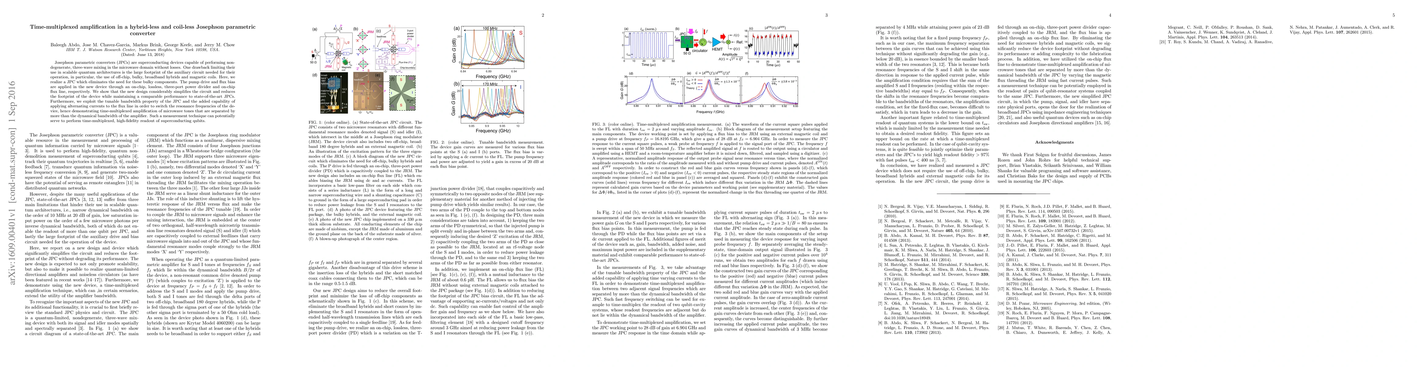 This paper presents a novel, hybrid-less and coil-less Josephson parametric converter (JPC) that eliminates bulky off-chip components while maintaining comparable performance. The new design uses on-chip components to simplify the circuit and reduce footprint, and demonstrates time-multiplexed amplification for separated microwave tones, potentially enabling high-fidelity readout of superconducting qubits.