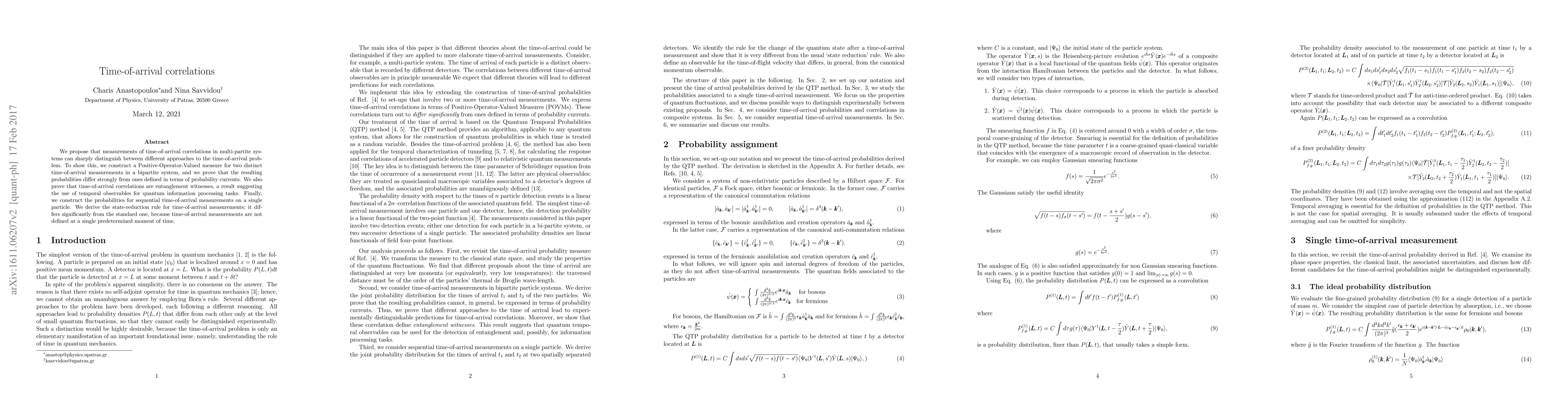 We propose that measurements of time-of-arrival correlations in multi-partite systems can sharply distinguish between different approaches to the time-of-arrival problem. To show this, we construct a Positive-Operator-Valued measure for two distinct time-of-arrival measurements in a bipartite system, and we prove that the resulting probabilities differ strongly from ones defined in terms of probability currents. We also prove that time-of-arrival correlations are entanglement witnesses, a result suggesting the use of temporal observables for quantum information processing tasks. Finally, we construct the probabilities for sequential time-of-arrival measurements on a single particle. We derive the state-reduction rule for time-of-arrival measurements; it differs significantly from the standard one, because time-of-arrival measurements are not defined at a single predetermined moment of time.