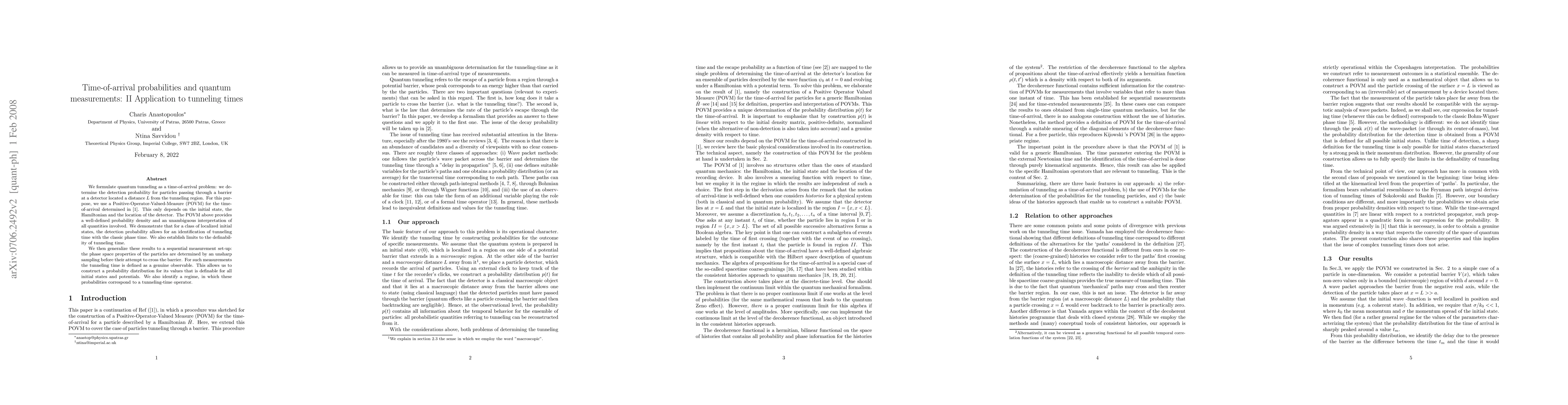 We formulate quantum tunneling as a time-of-arrival problem: we determine the detection probability for particles passing through a barrier at a detector located a distance L from the tunneling region. For this purpose, we use a Positive-Operator-Valued-Measure (POVM) for the time-of-arrival determined in quant-ph/0509020 [JMP 47, 122106 (2006)]. This only depends on the initial state, the Hamiltonian and the location of the detector. The POVM above provides a well-defined probability density and an unambiguous interpretation of all quantities involved. We demonstrate that for a class of localized initial states, the detection probability allows for an identification of tunneling time with the classic phase time. We also establish limits to the definability of tunneling time. We then generalize these results to a sequential measurement set-up: the phase space properties of the particles are determined by an unsharp sampling before their attempt to cross the barrier. For such measurements the tunneling time is defined as a genuine observable. This allows us to construct a probability distribution for its values that is definable for all initial states and potentials. We also identify a regime, in which these probabilities correspond to a tunneling-time operator.